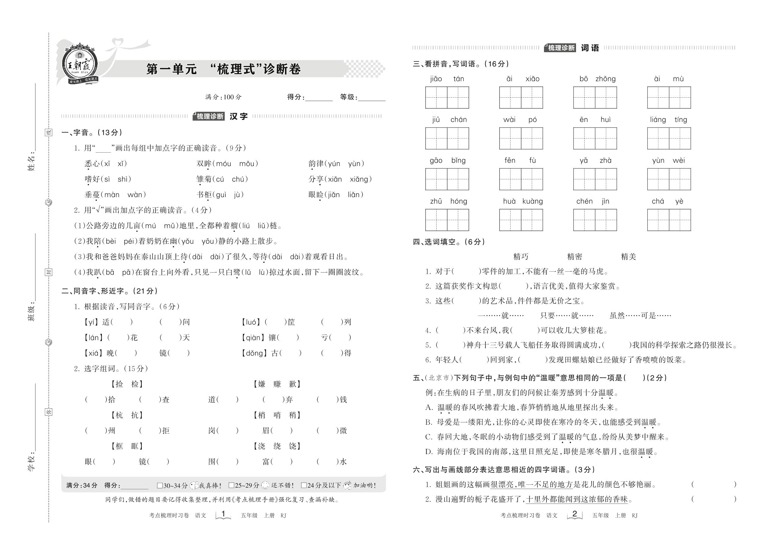 2022上册五年级语文人教版 第一单元 “梳理式”诊断卷