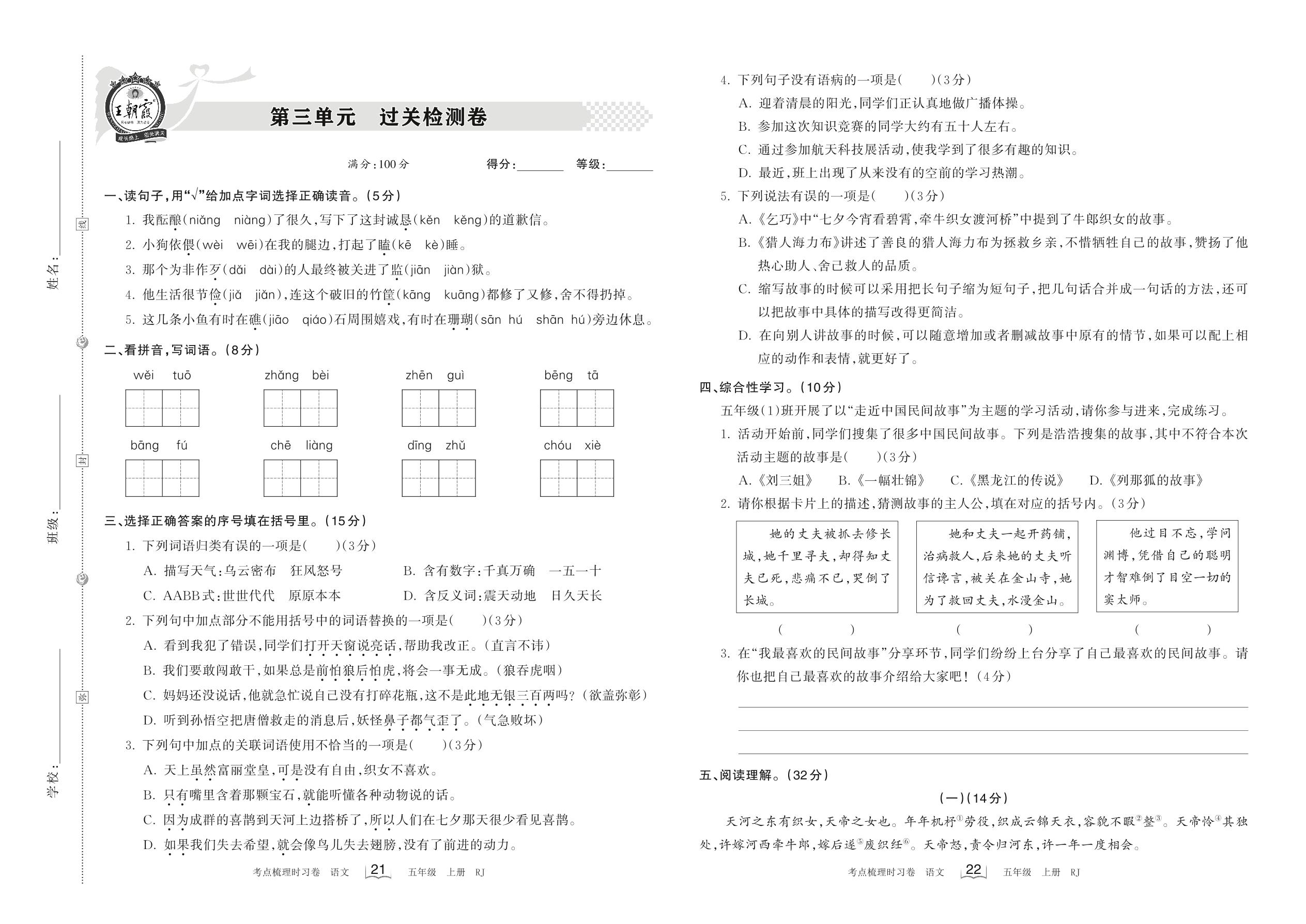 2022上册五年级语文人教版 第三单元 过关检测卷