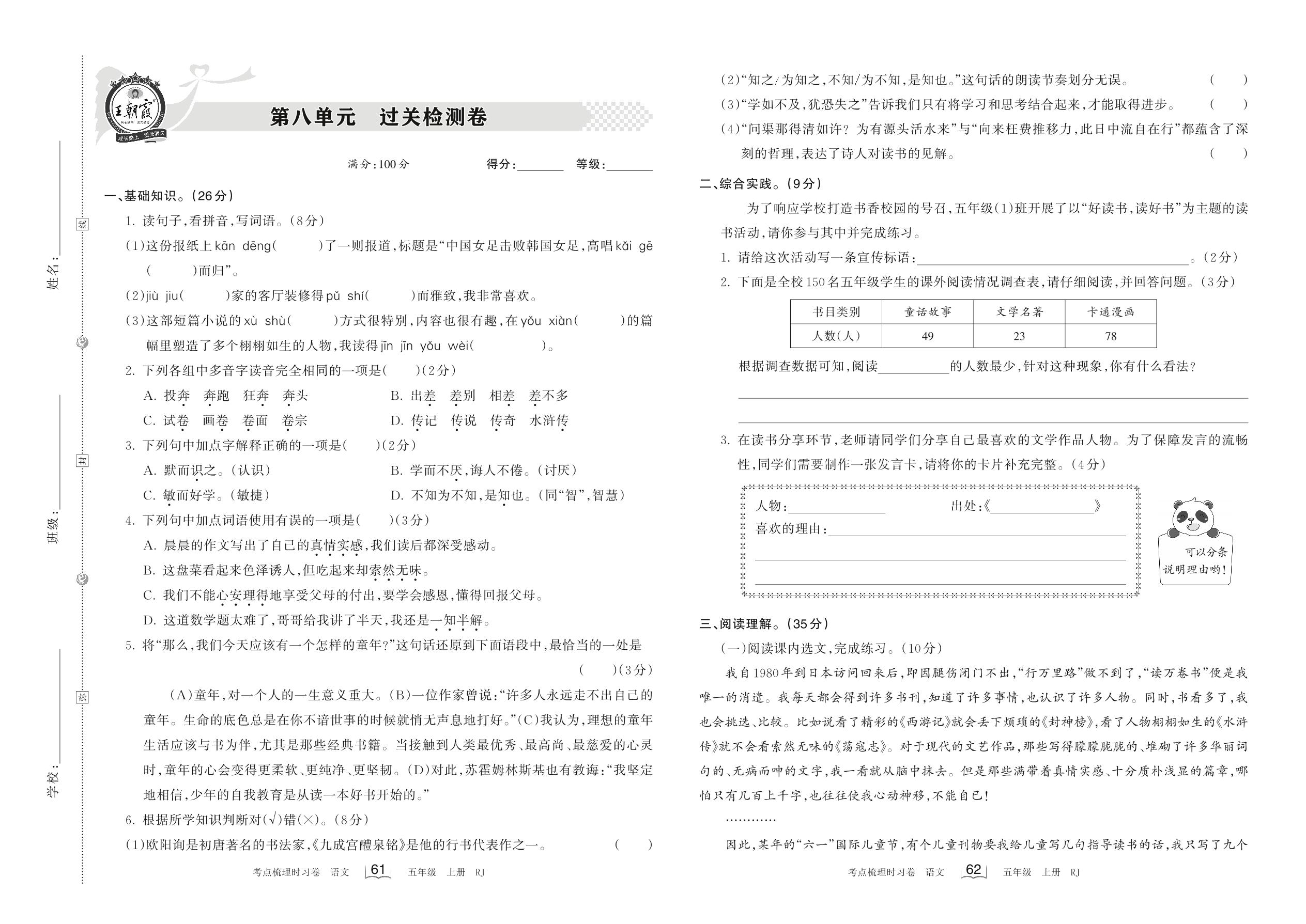 2022上册五年级语文人教版 第八单元 过关检测卷