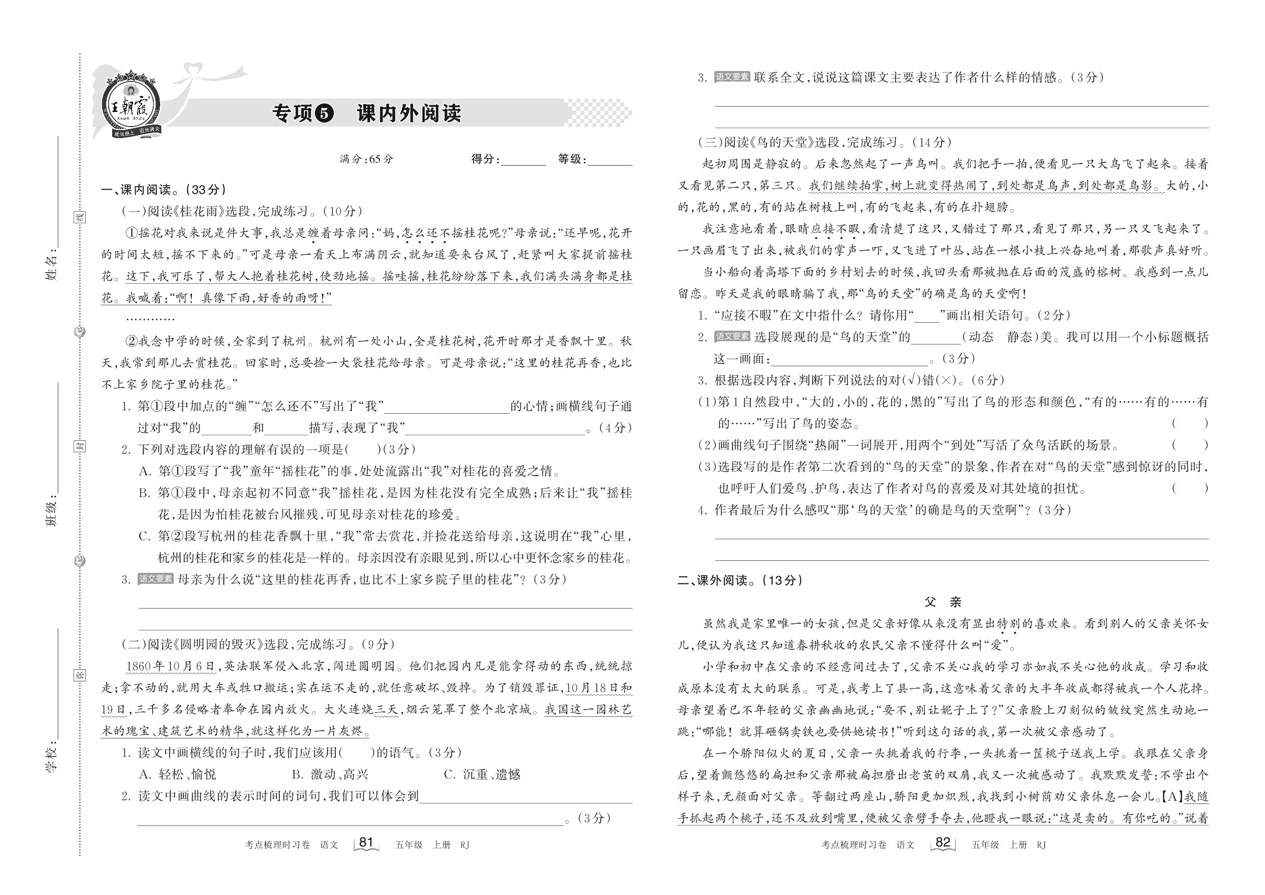 2022上册五年级语文人教版 专项5 课内外阅读