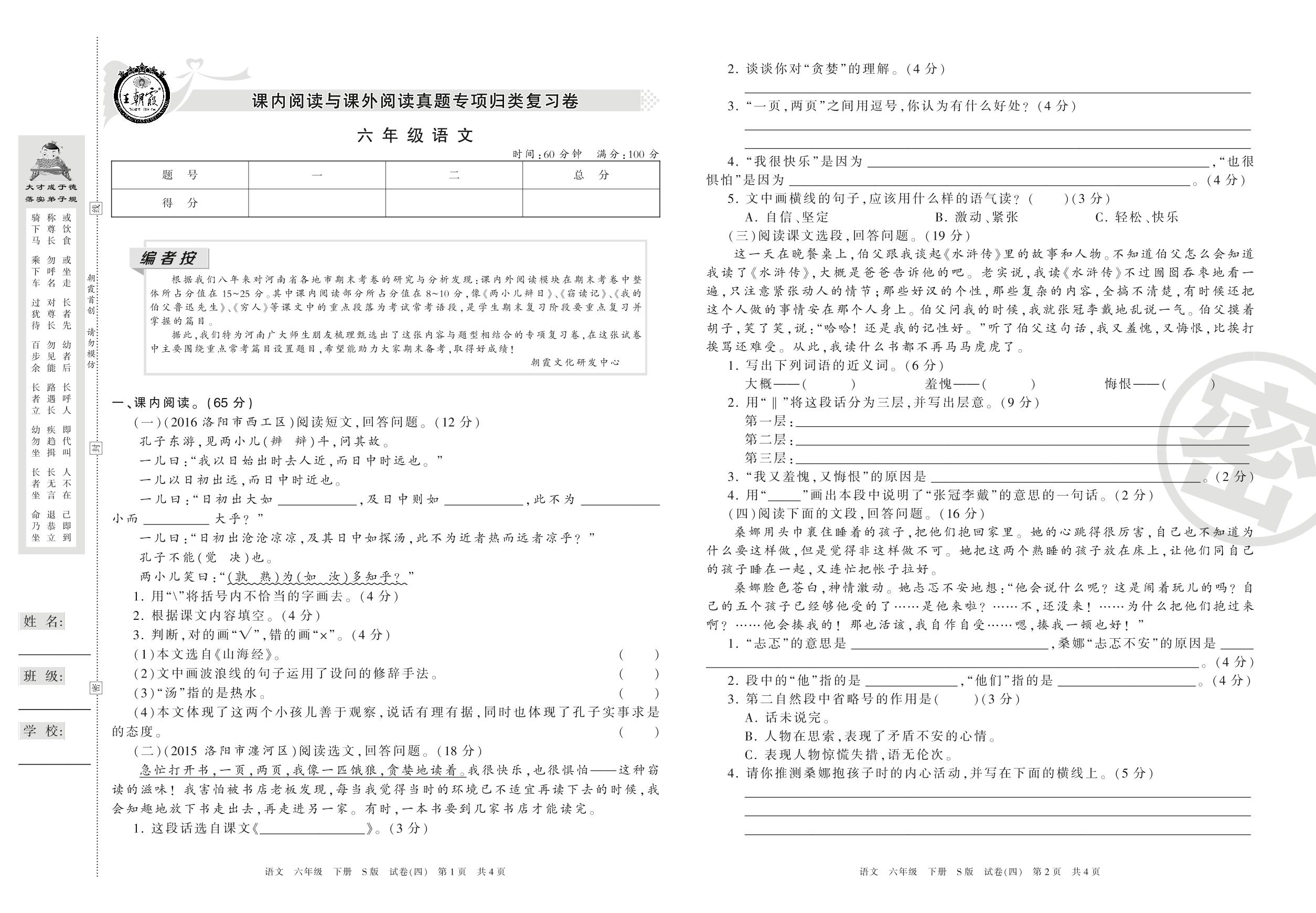 王朝霞期末专项卷六年级下册语文(S版)_R21080284146【4】