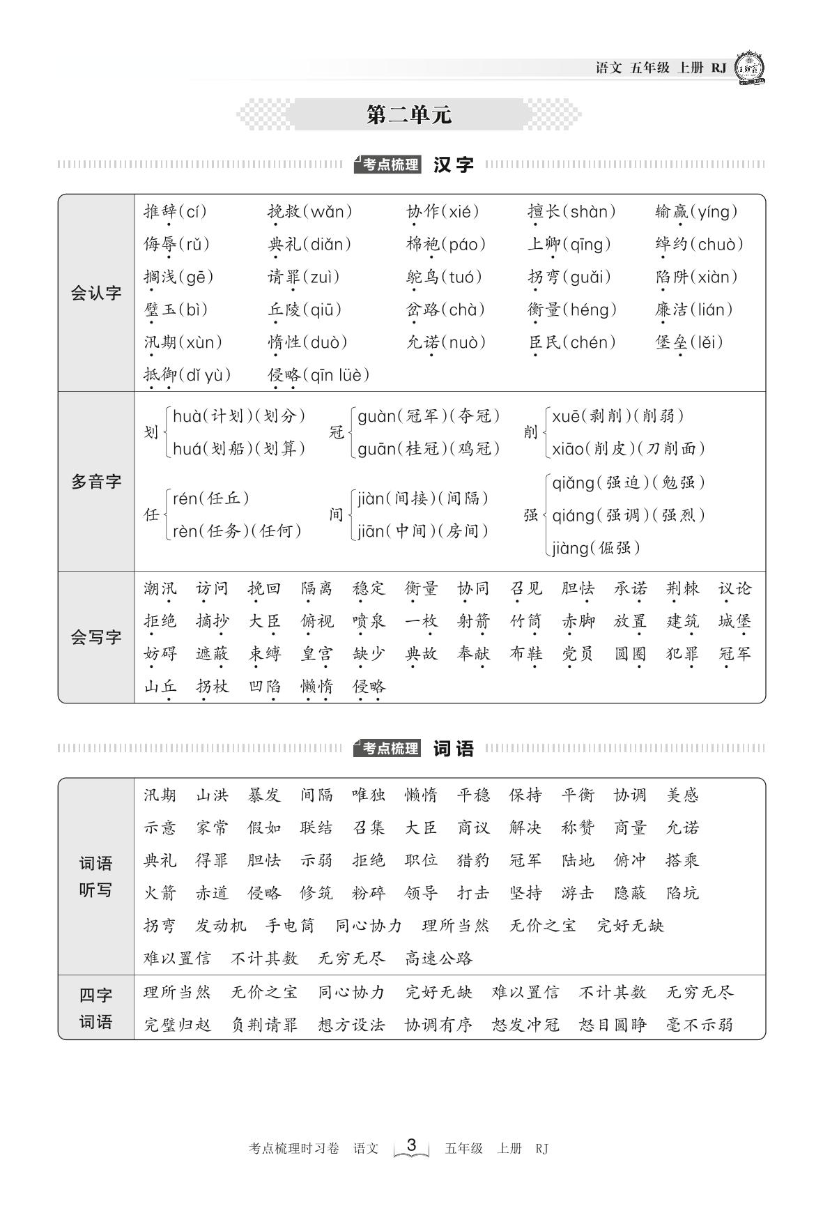 2022上册五年级语文人教版 考点梳理手册——第二单元