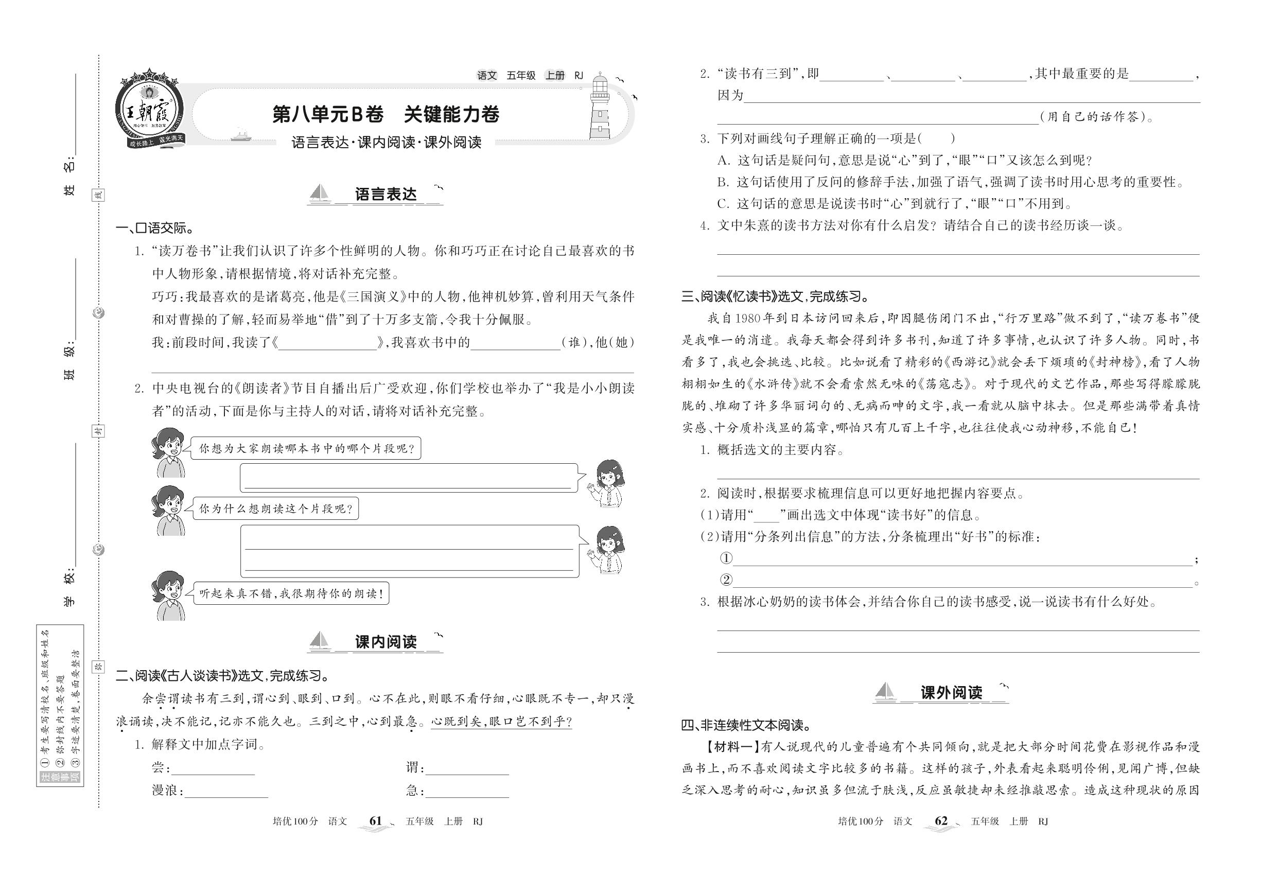 2022上册五年级语文人教版 第八单元B卷 关键能力卷