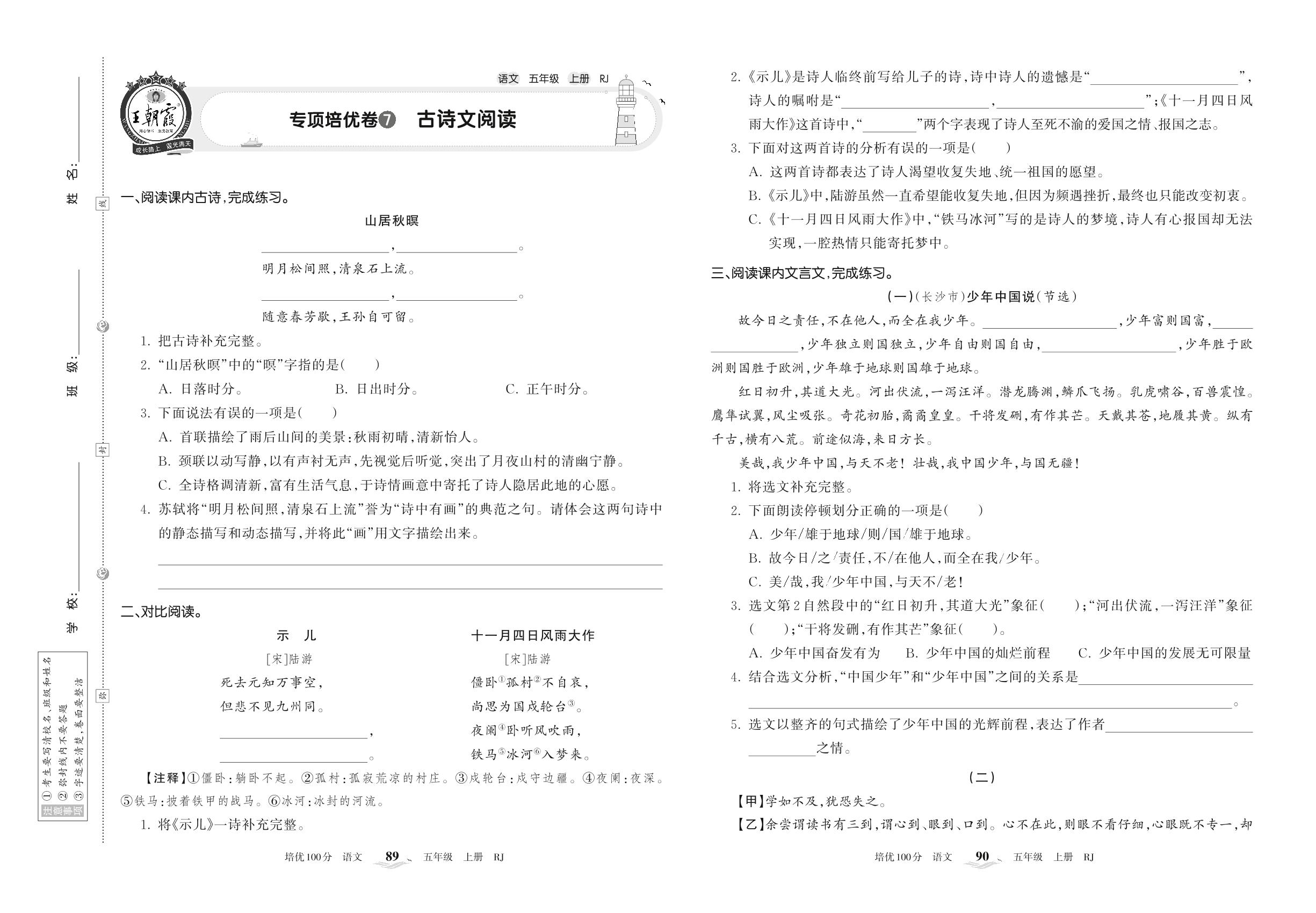 2022上册五年级语文人教版 专项培优卷7 古诗文阅读