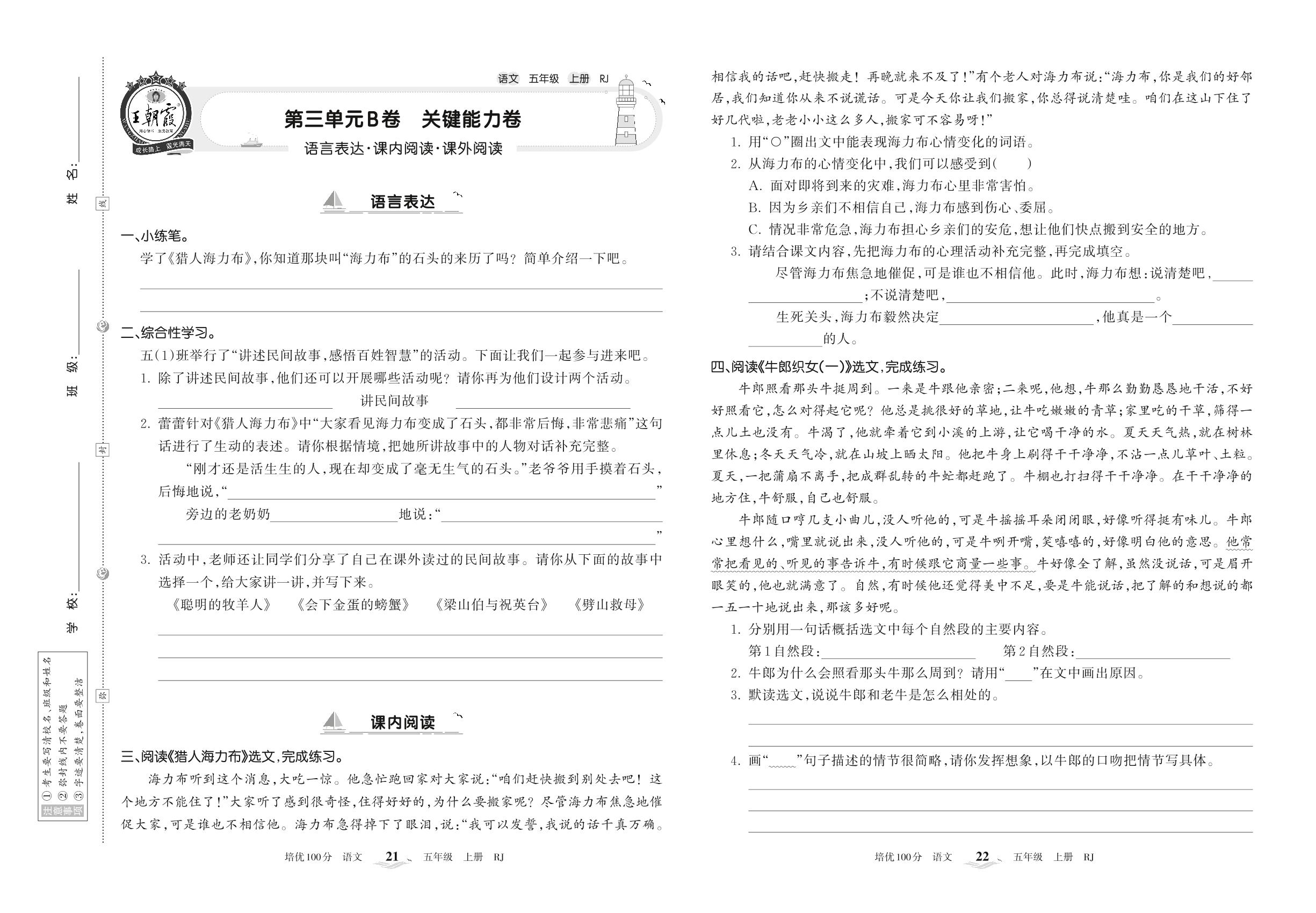 2022上册五年级语文人教版 第三单元B卷 关键能力卷