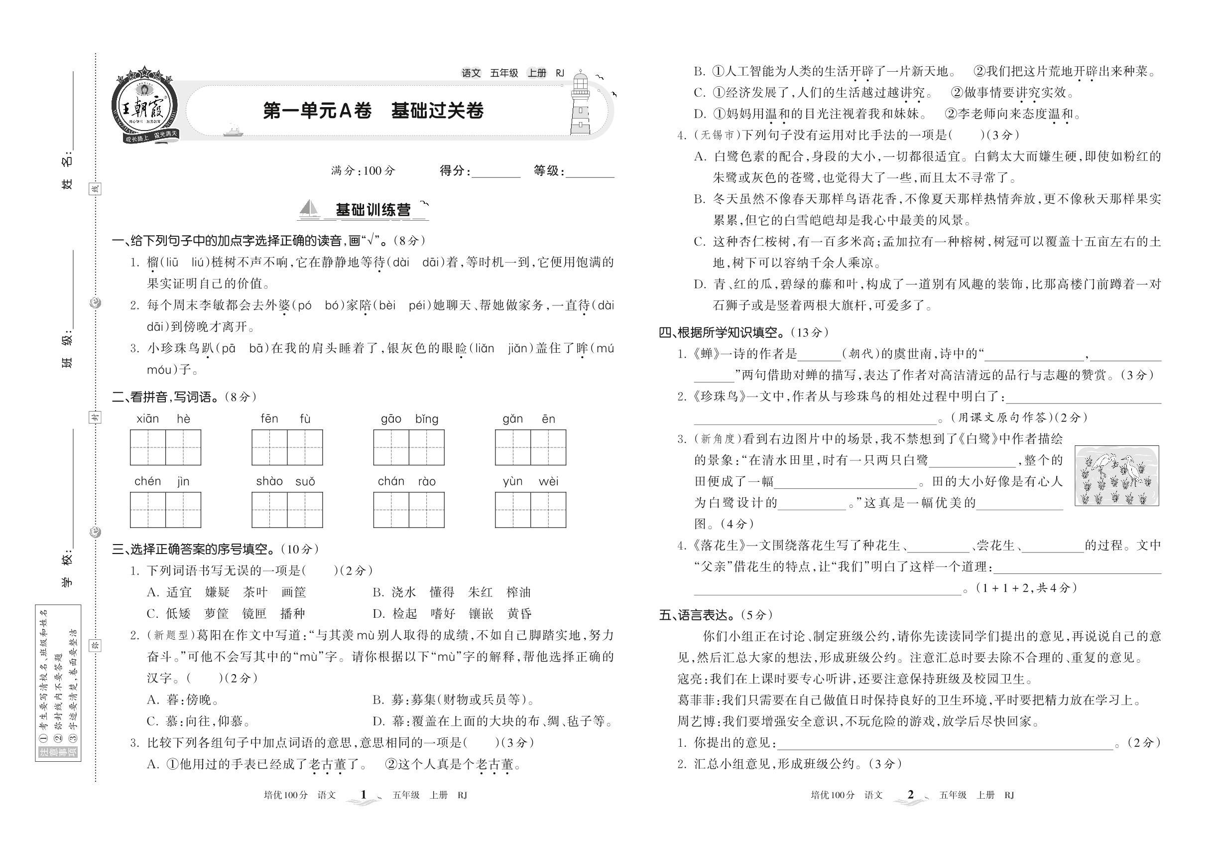 2022上册五年级语文人教版 第一单元A卷 基础过关卷