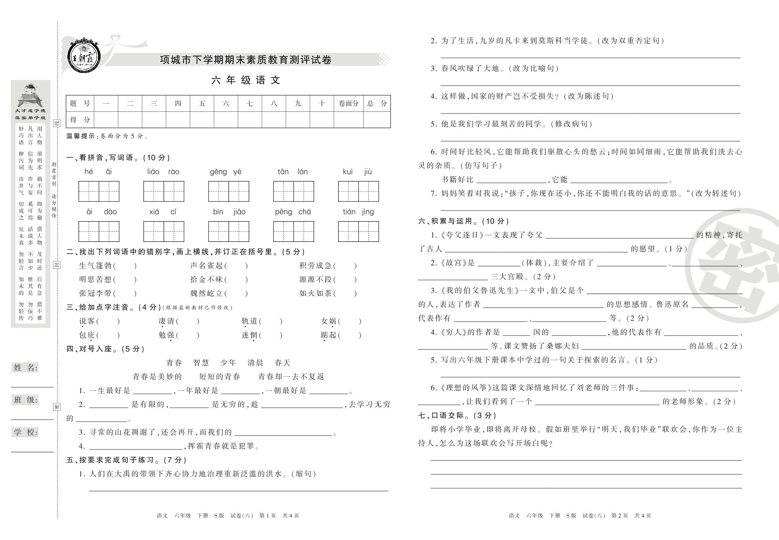 2015-2016学年第二学期项城市六年级语文试卷(S版)【8】