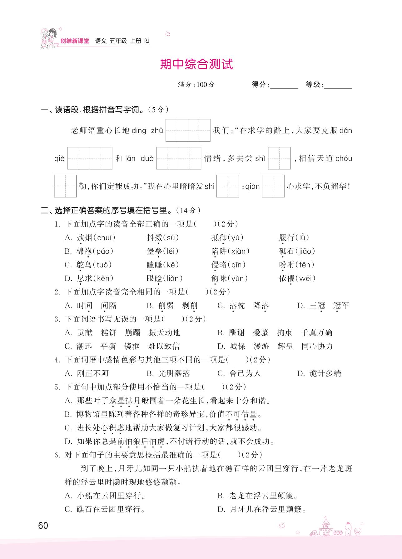 2022上册五年级语文人教版 期中综合测试