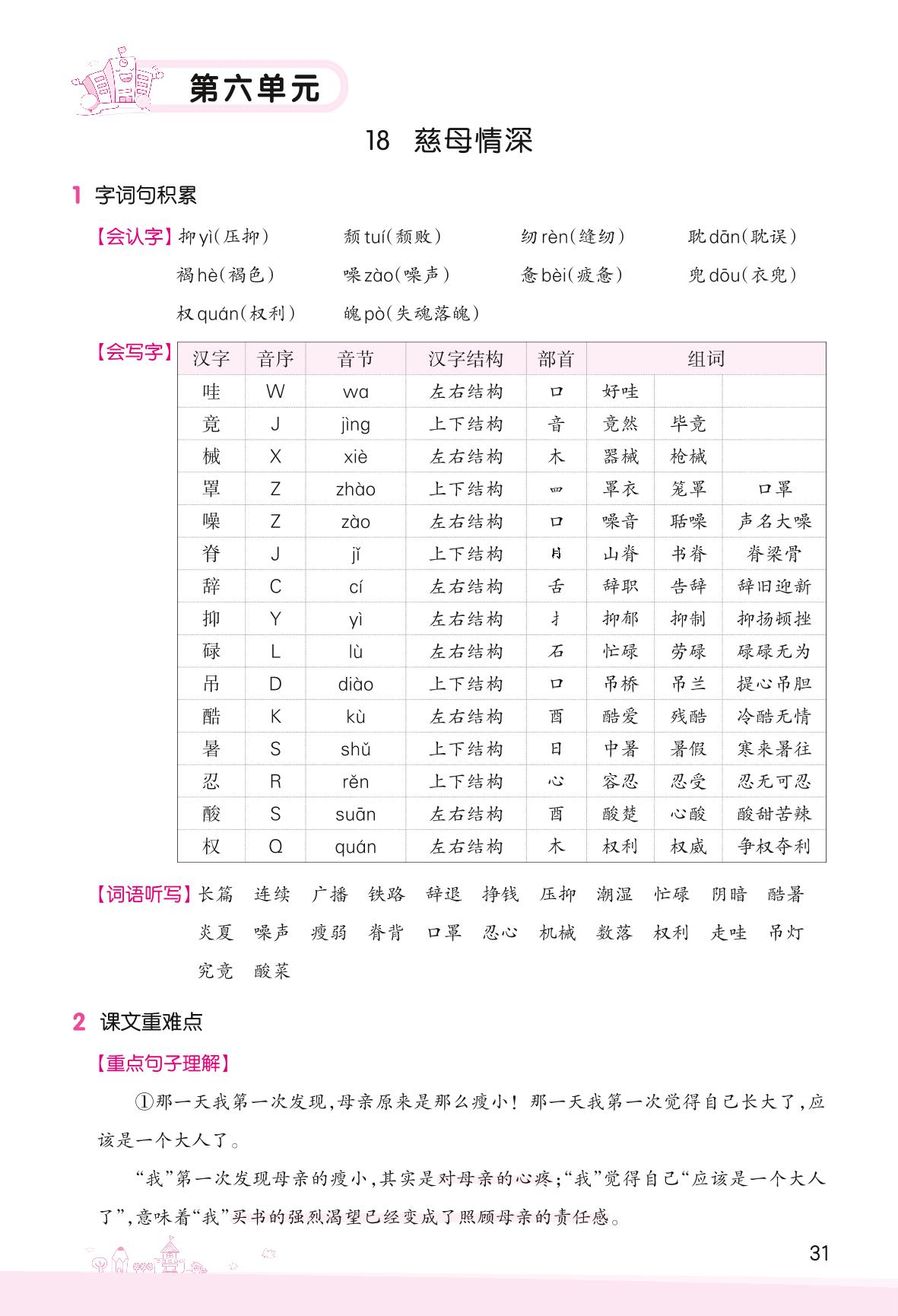 2022上册五年级语文人教版 助学手册 第六单元——18 慈母情深
