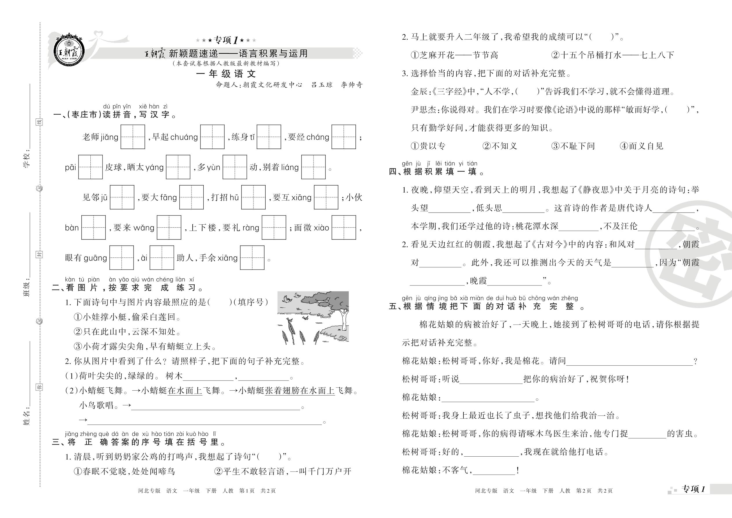 王朝霞期末专项卷——语言积累与运用、句子与口语交际真题归类复习一年级下册语文(人教版)_R210731173250【0】
