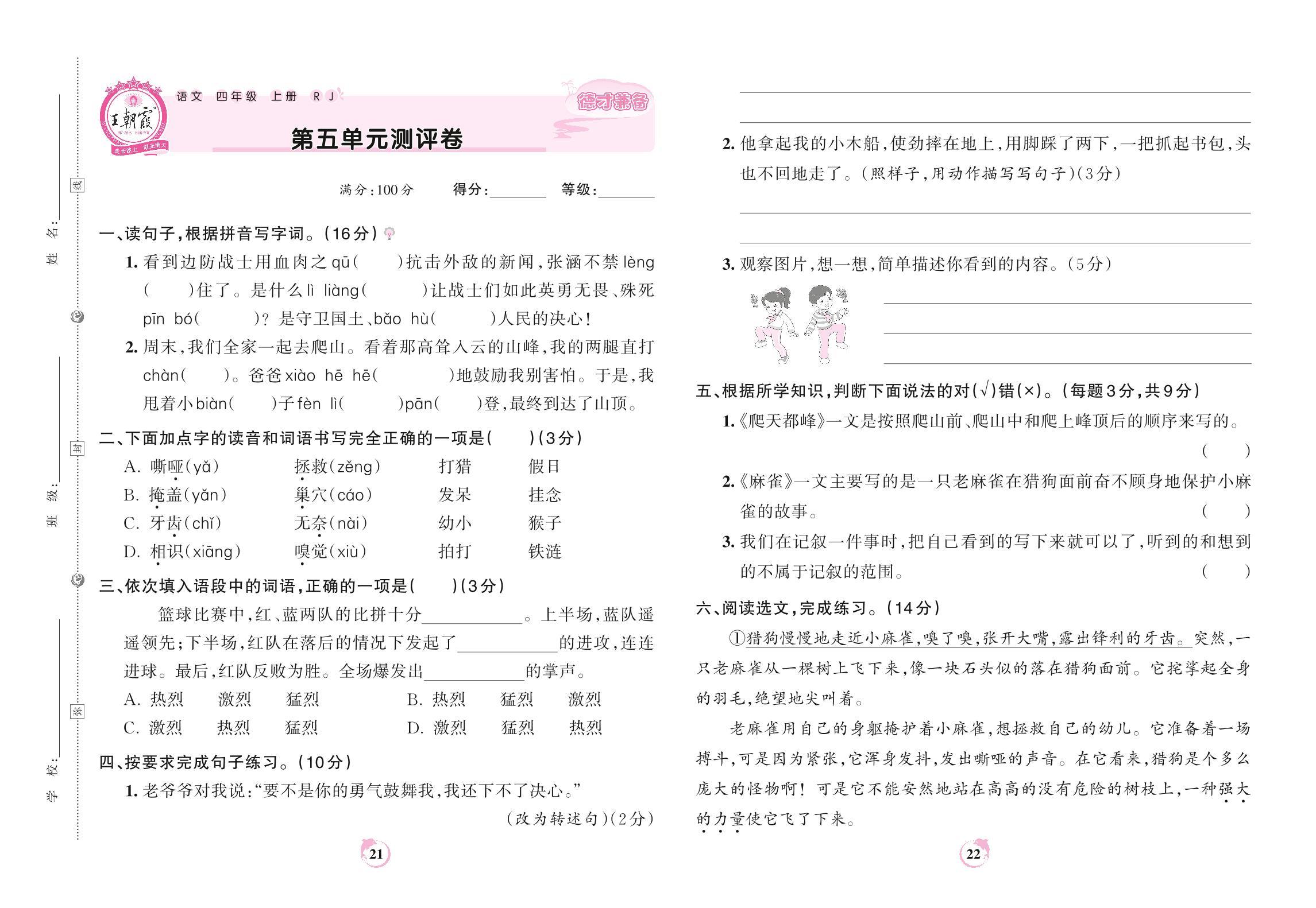 2022上册四年级语文人教版 第五单元测评卷