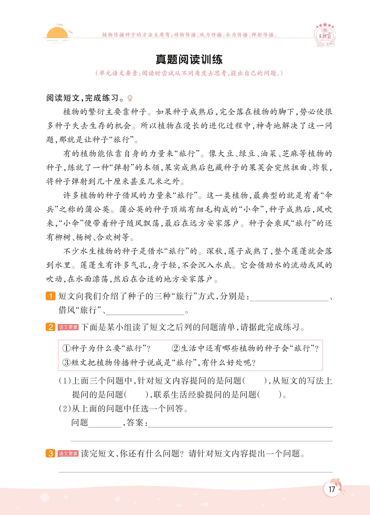 2022上册四年级语文人教版 第二单元 阅读策略 提问——真题阅读训练(阅读提升)
