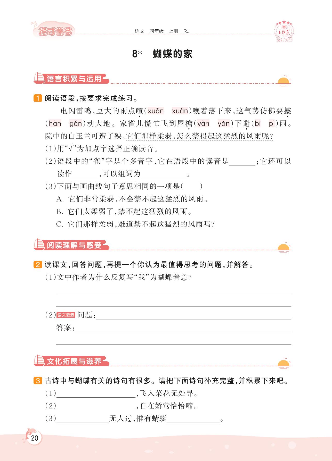 2022上册四年级语文人教版 第二单元 阅读策略 提问——8 蝴蝶的家