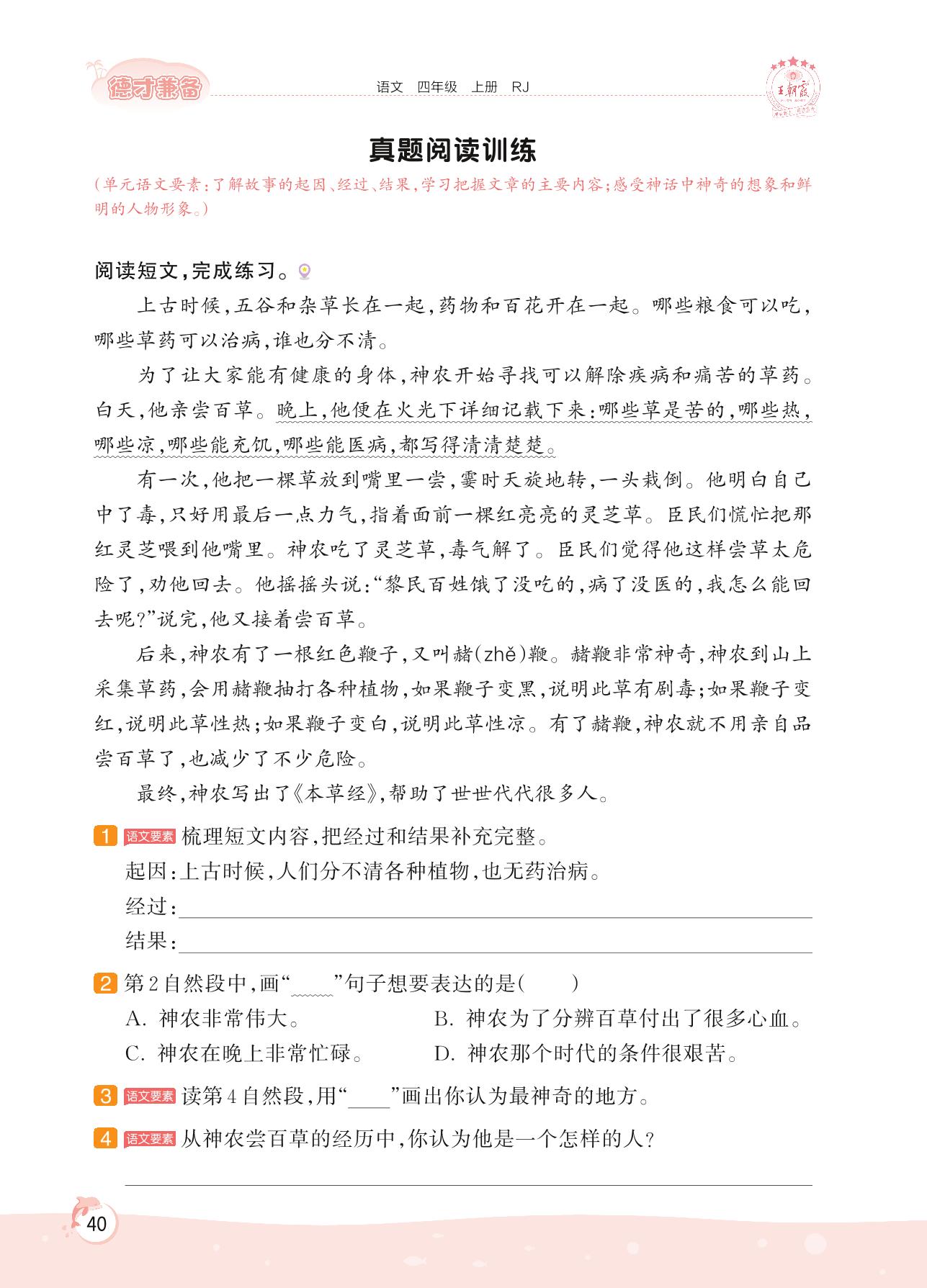 2022上册四年级语文人教版 第四单元 神话故事——真题阅读训练(阅读提升)
