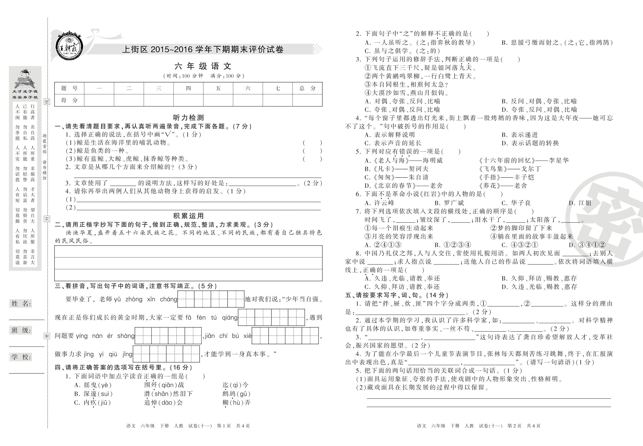 2015-2016学年第二学期郑州市上街区六年级语文试卷(人教版)【11】
