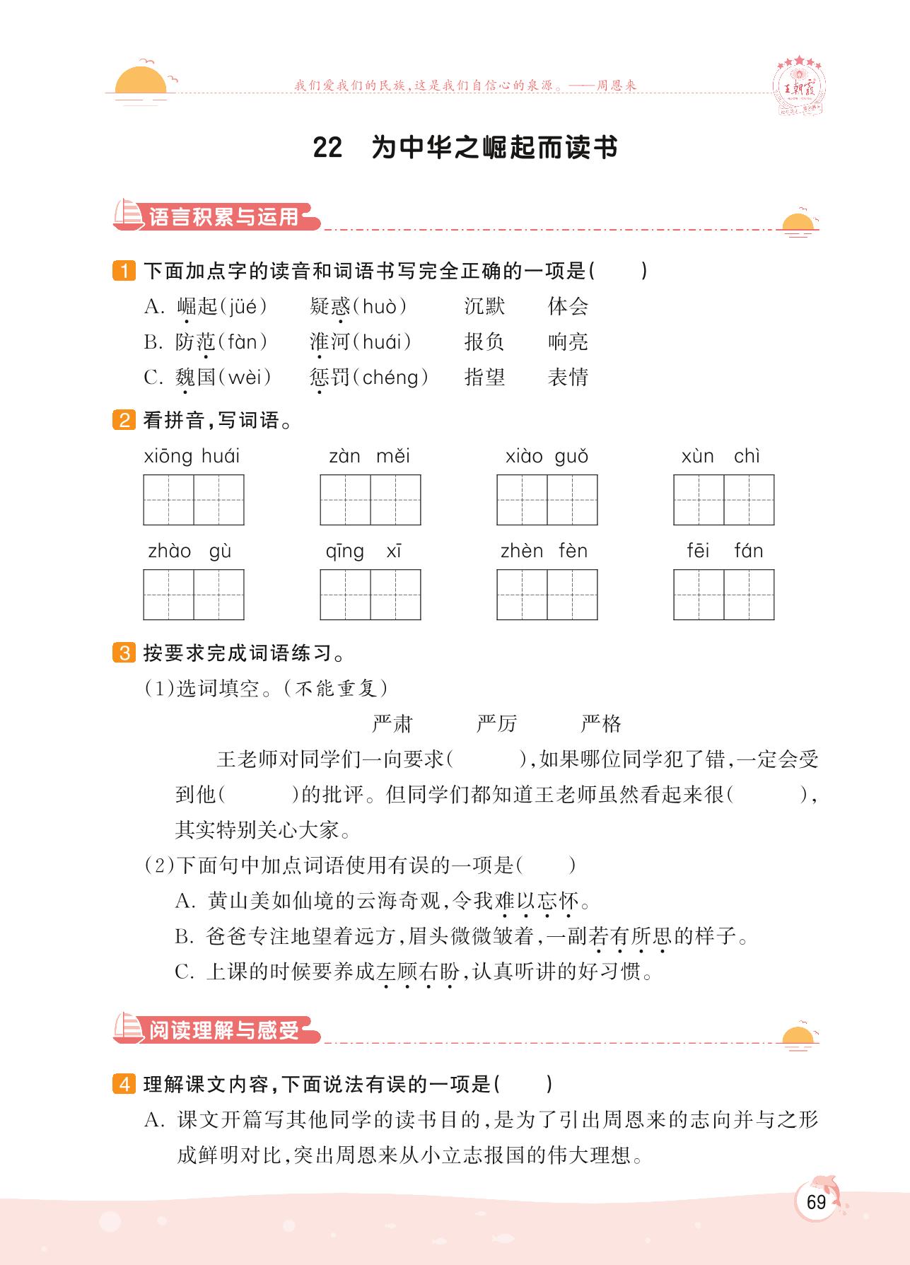 2022上册四年级语文人教版 第七单元 家国情怀——22 为中华之崛起而读书