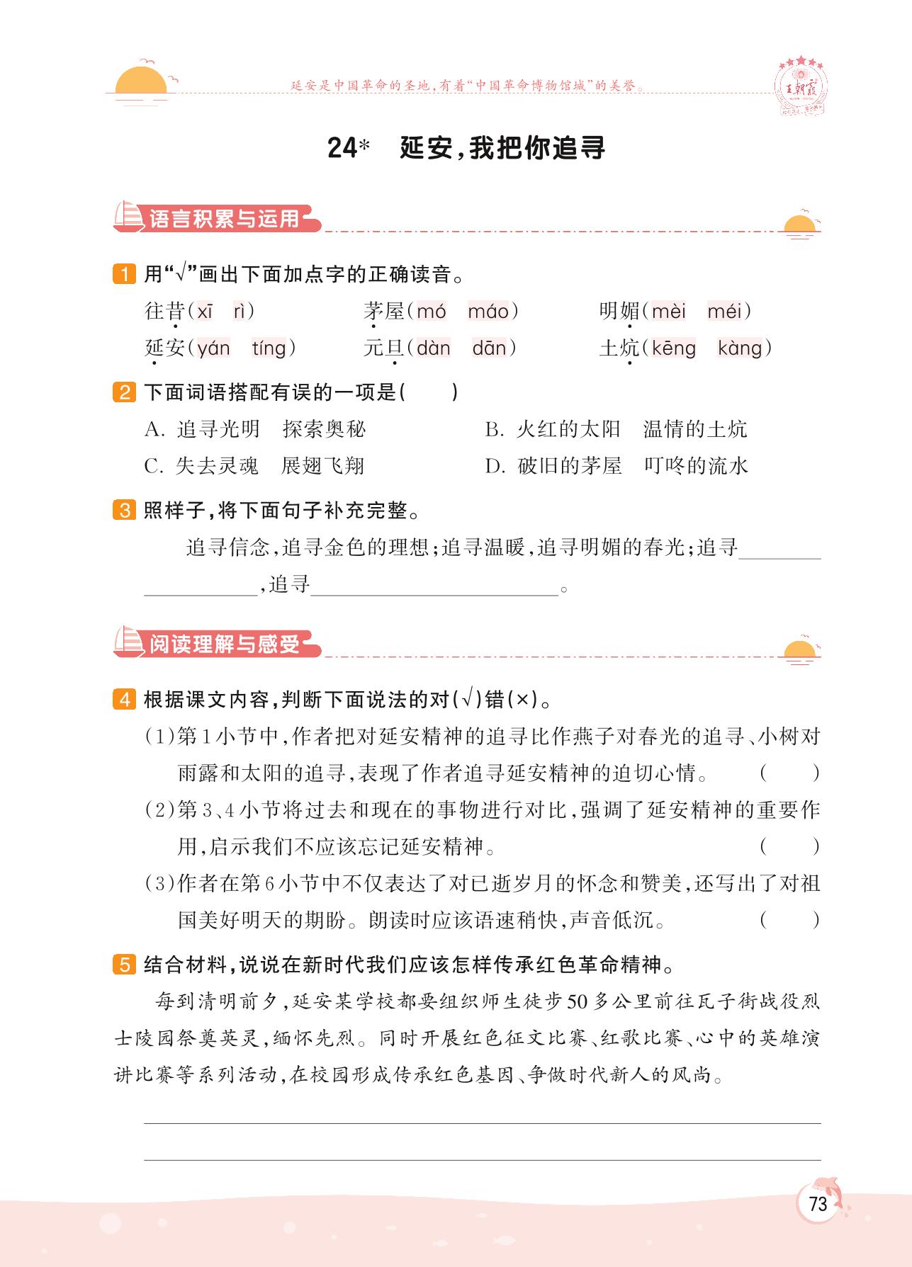 2022上册四年级语文人教版 第七单元 家国情怀——24 延安,我把你追寻