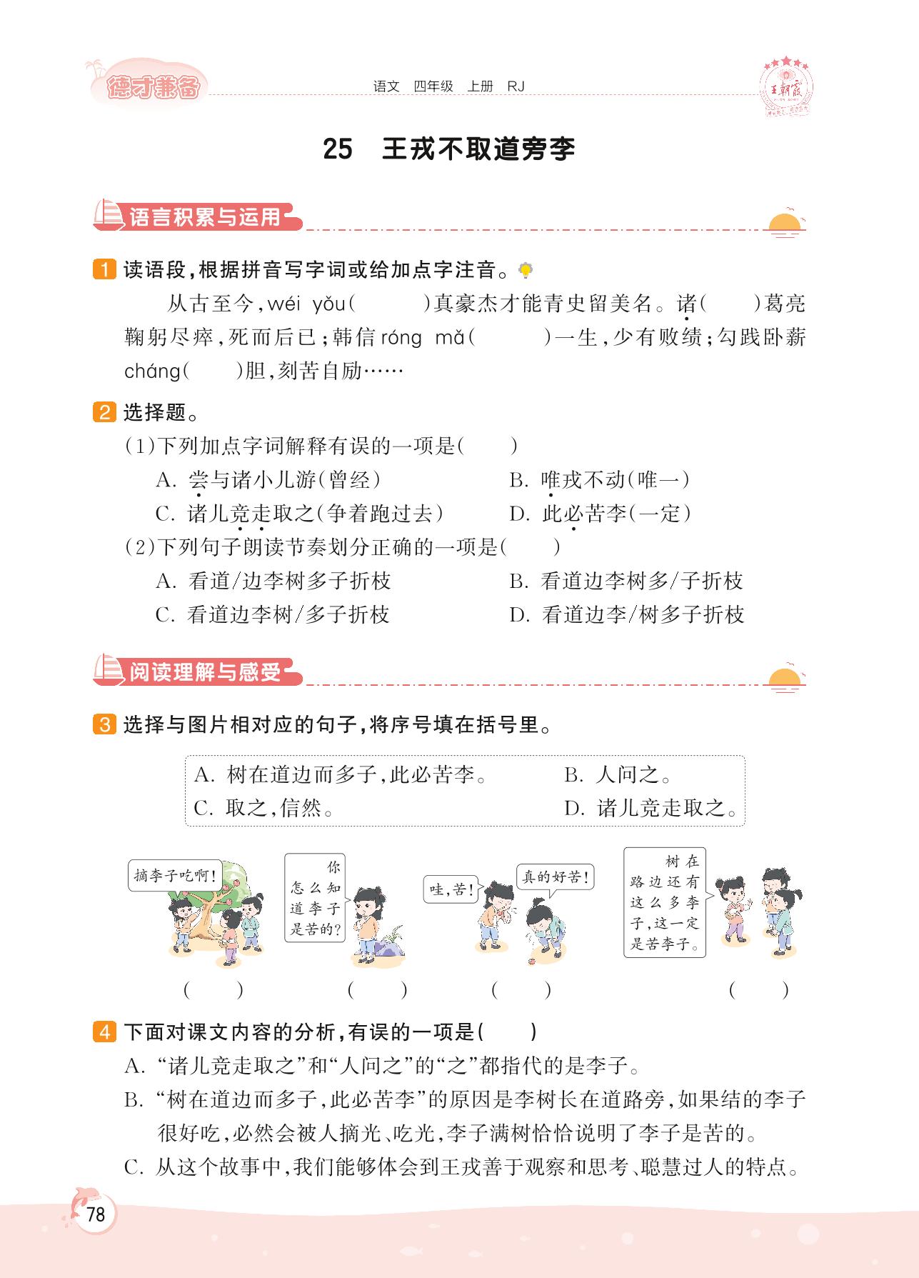 2022上册四年级语文人教版 第八单元 历史传说故事——25 王戎不取道旁李