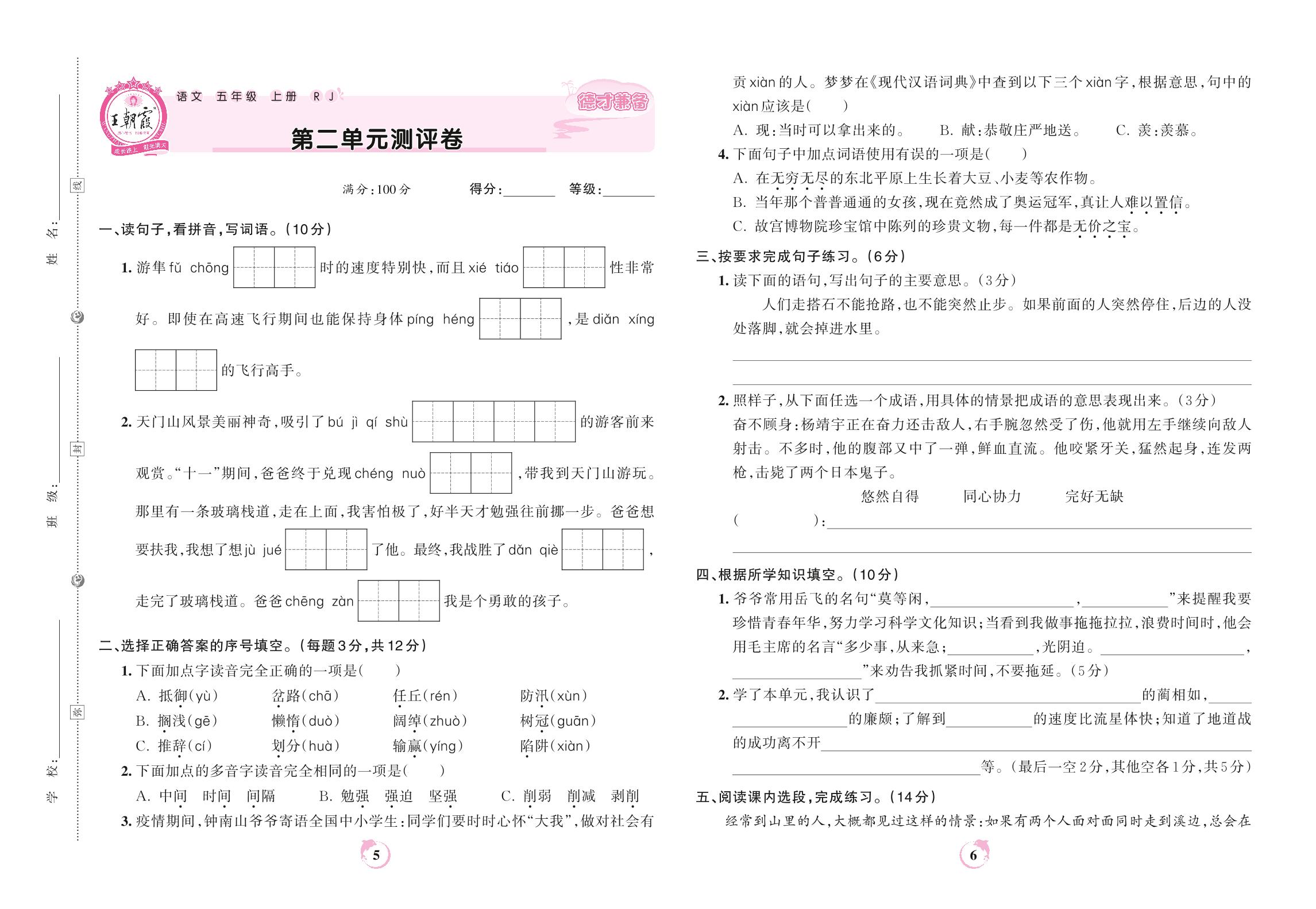 2022上册五年级语文人教版 第二单元测评卷