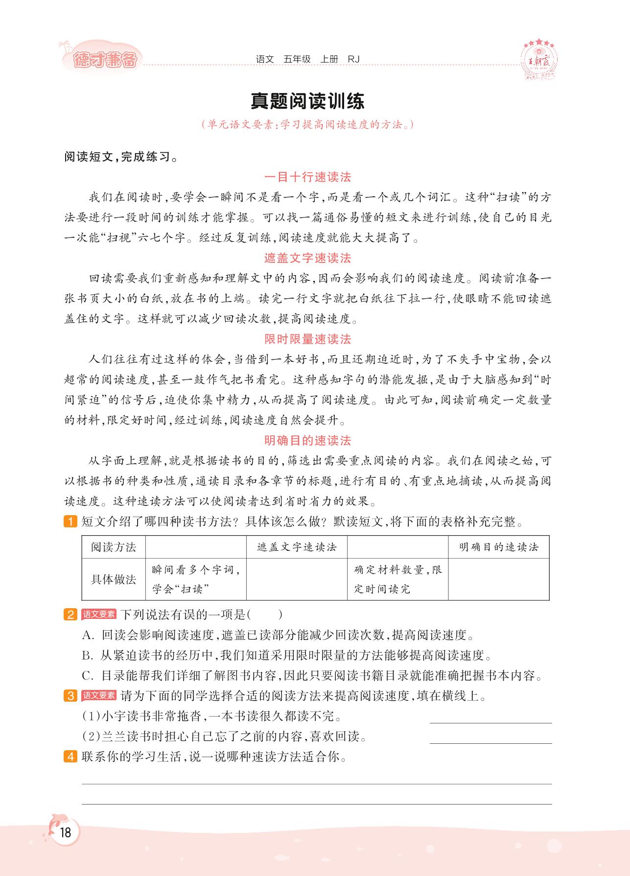 2022上册五年级语文人教版 第二单元 阅读策略 提高阅读速度——真题阅读训练(阅读提升)