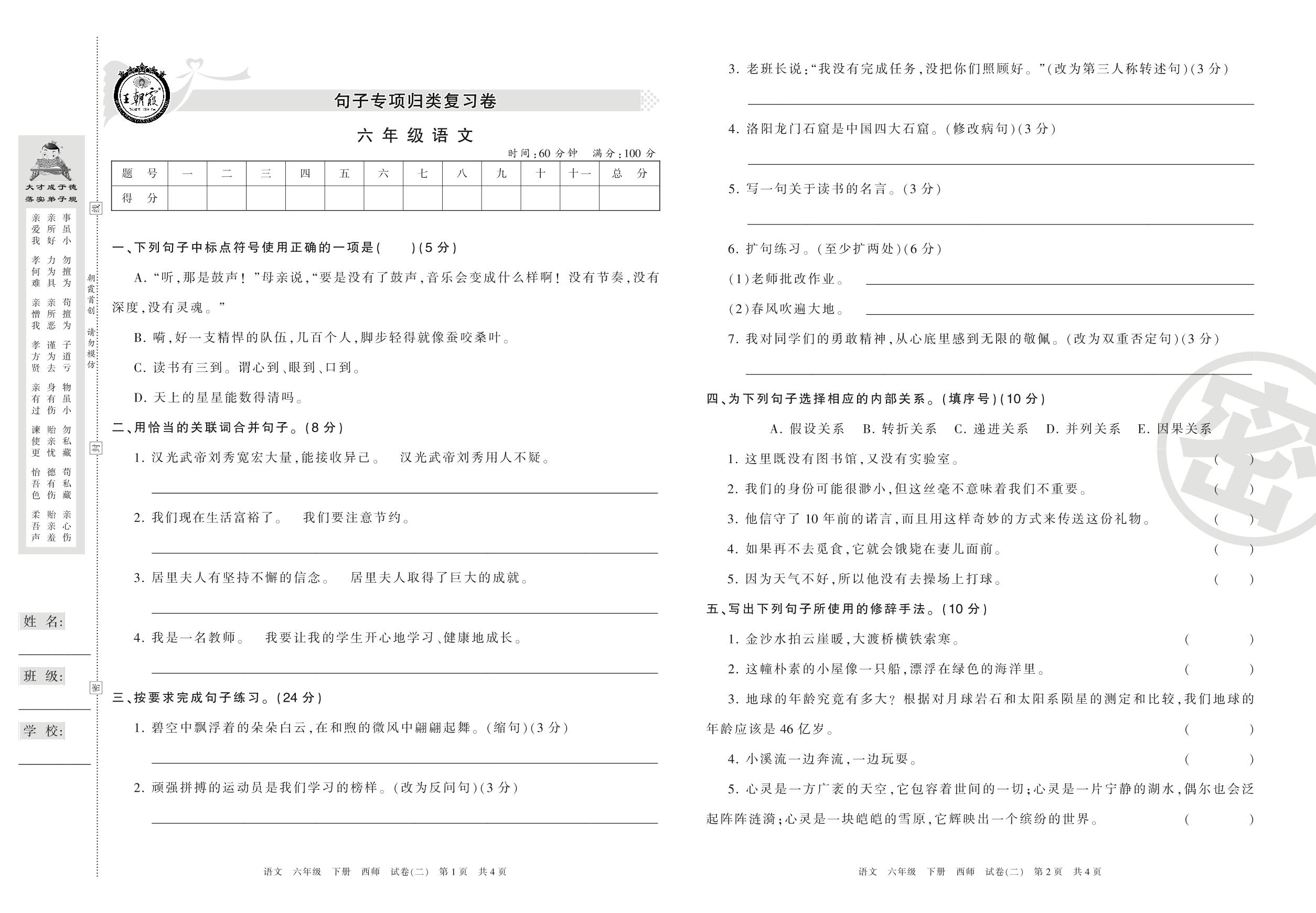 王朝霞期末专项卷六年级下册语文(西师版)_R21080284559【2】