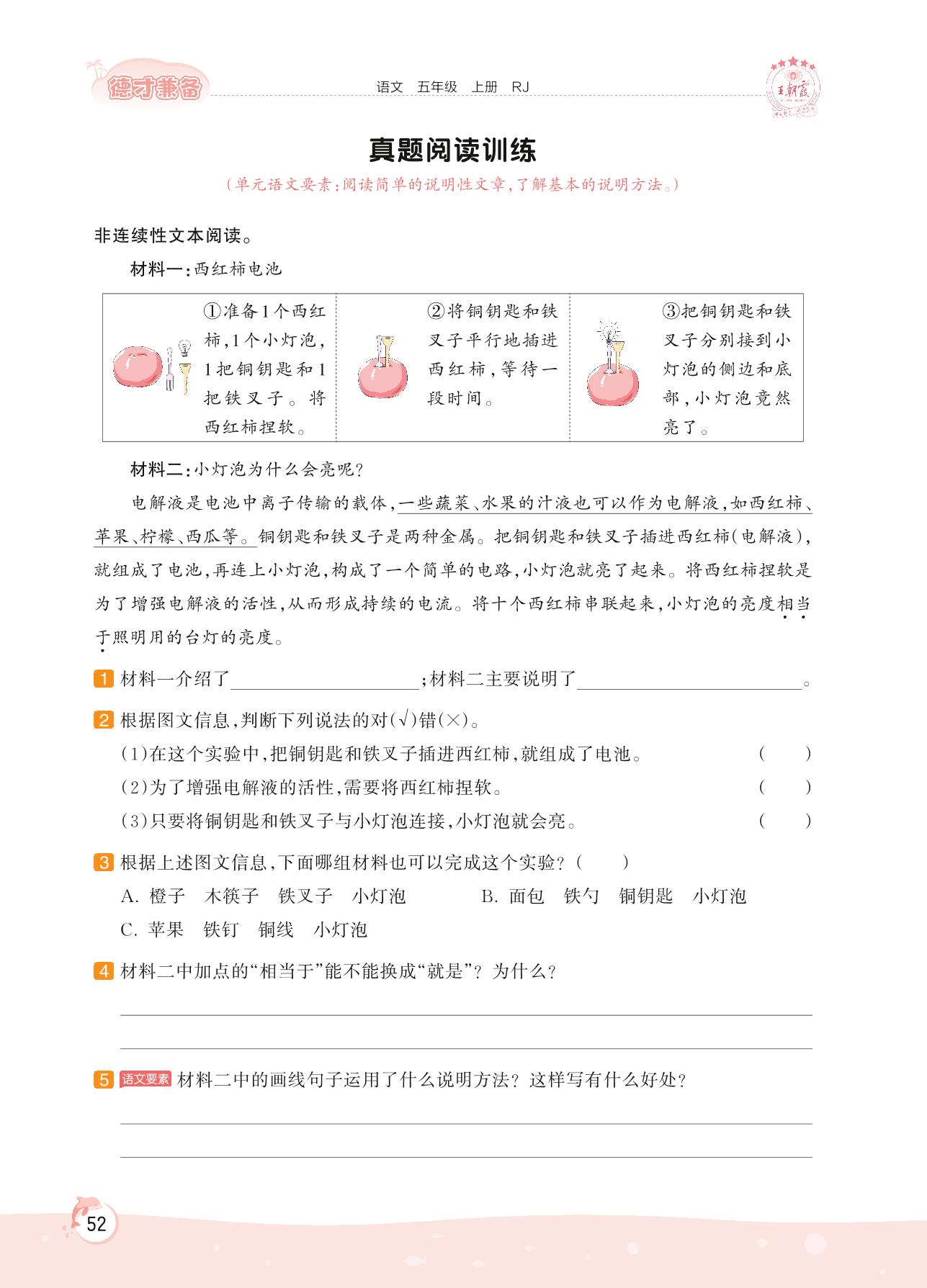 2022上册五年级语文人教版 第五单元 习作——真题阅读训练(阅读提升)
