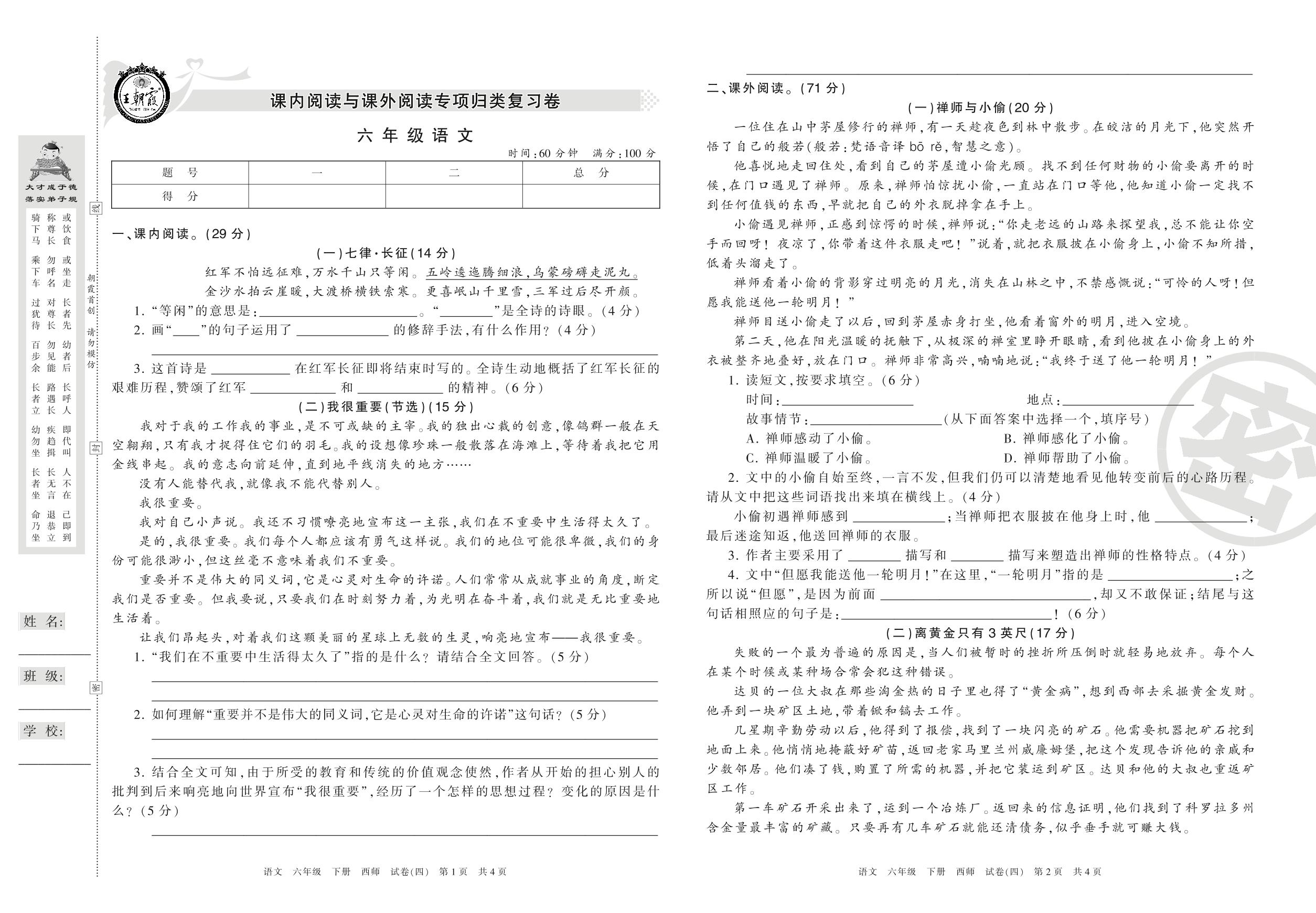 王朝霞期末专项卷六年级下册语文(西师版)_R21080284641【4】