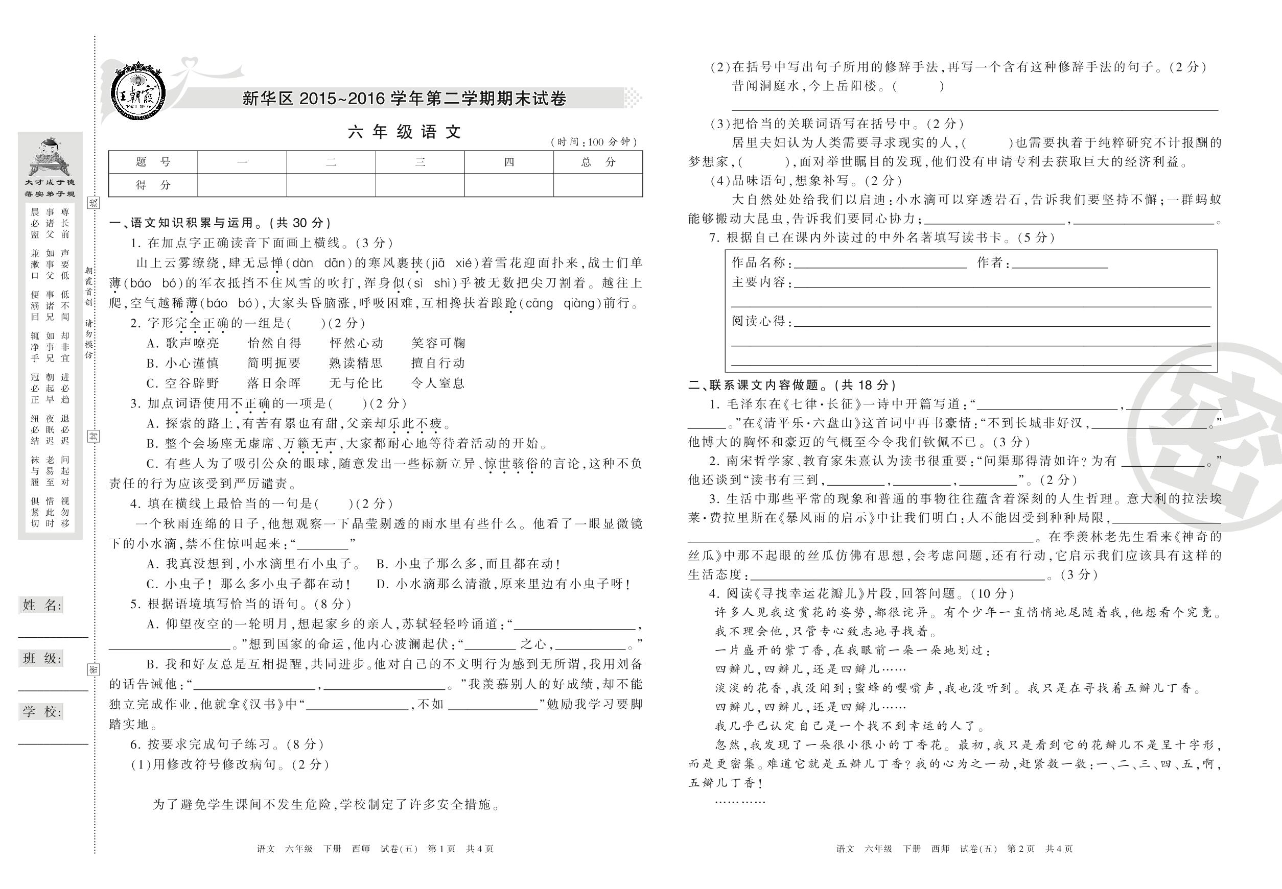 2015-2016学年第二学期平顶山市新华区六年级语文试卷(西师版)【5】