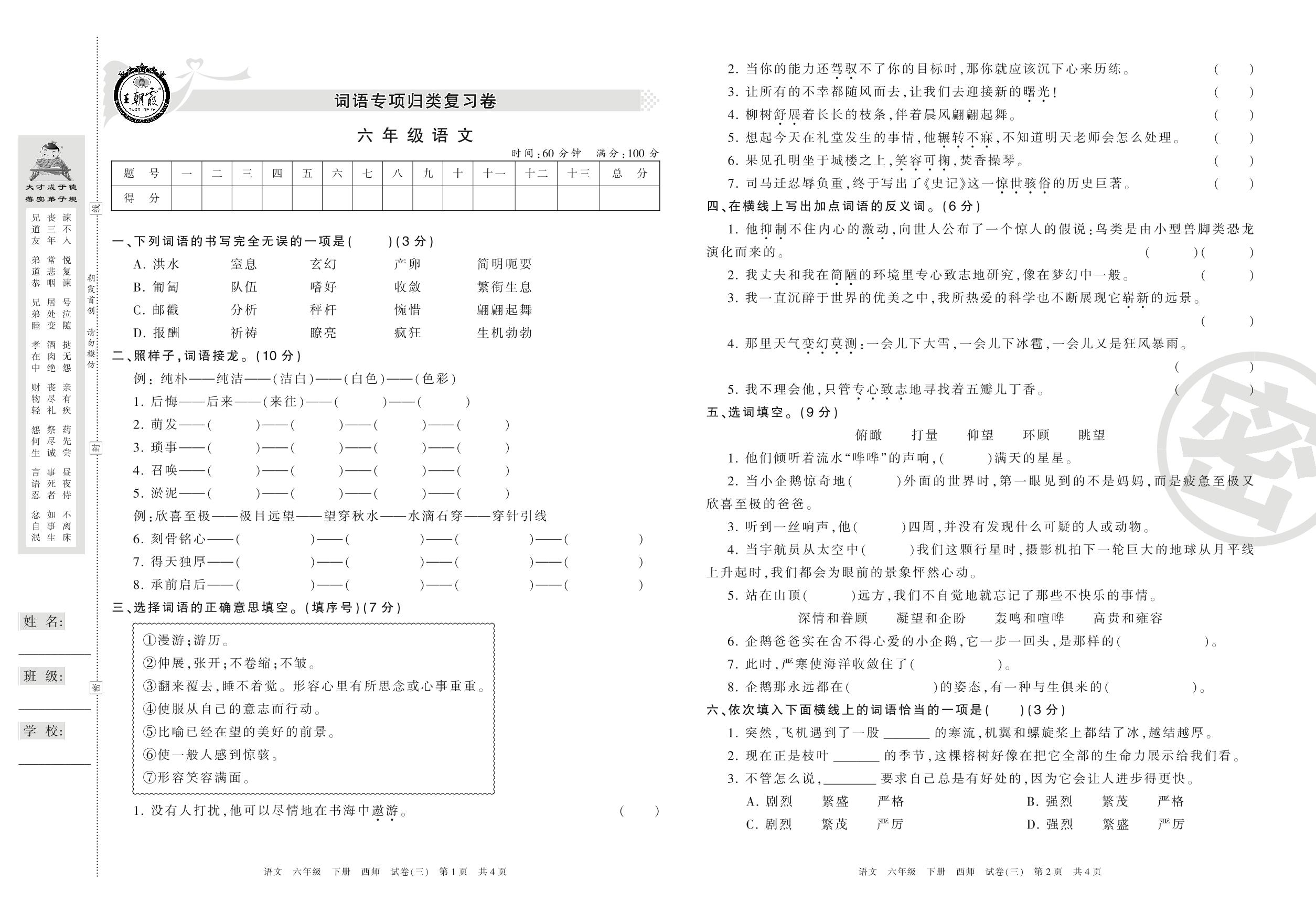 王朝霞期末专项卷六年级下册语文(西师版)_R21080284846【3】
