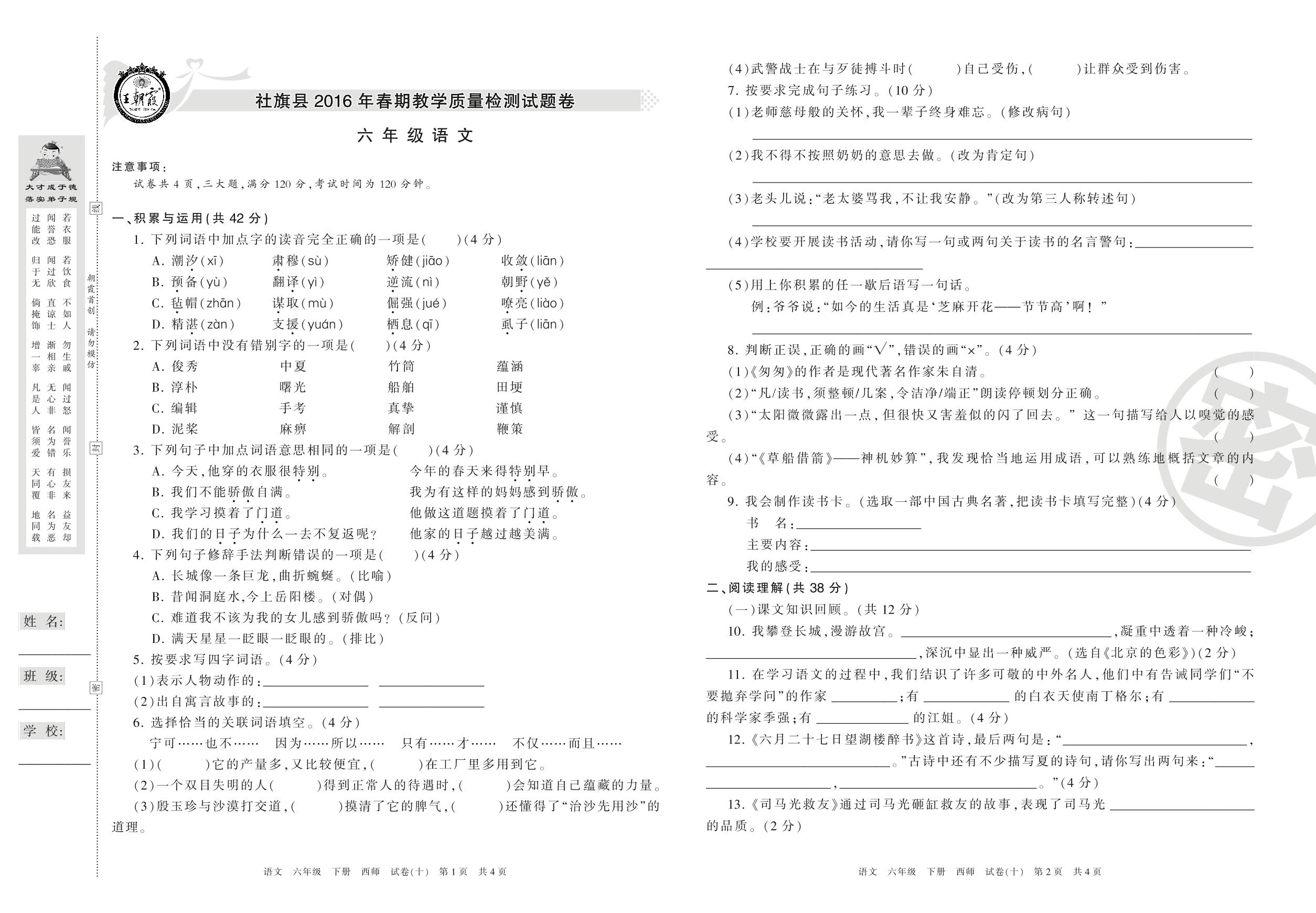 2015-2016学年第二学期南阳市社旗县六年级语文试卷(西师版)【10】