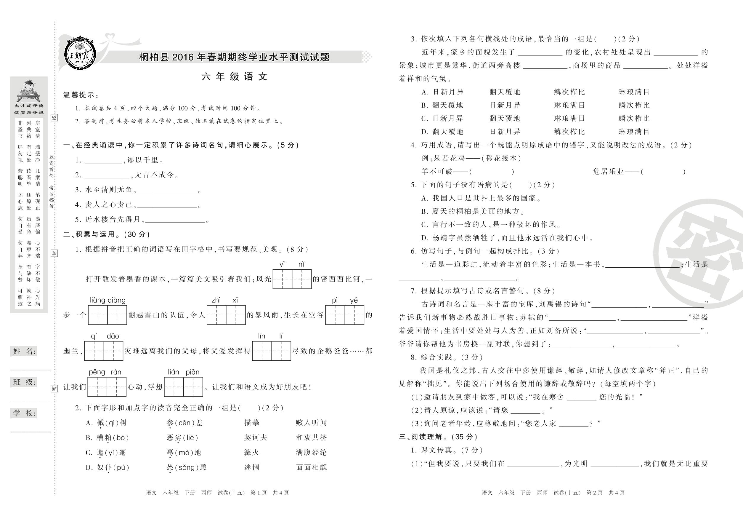 2015-2016学年第二学期南阳市桐柏县六年级语文试卷(西师版)【15】