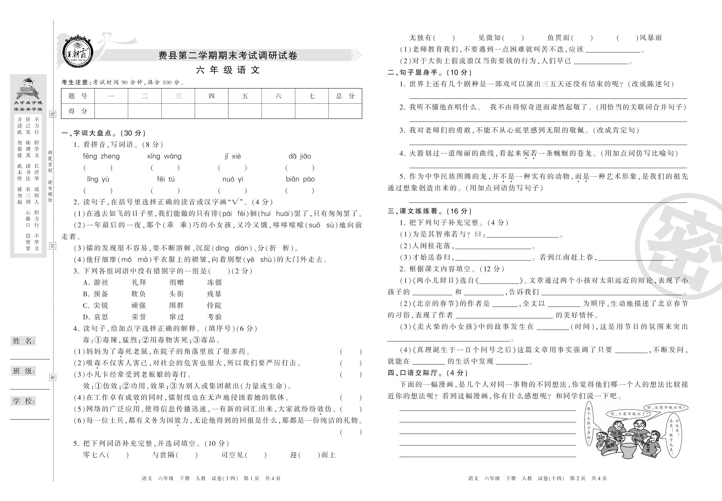 六年级语文人教版下册期末卷