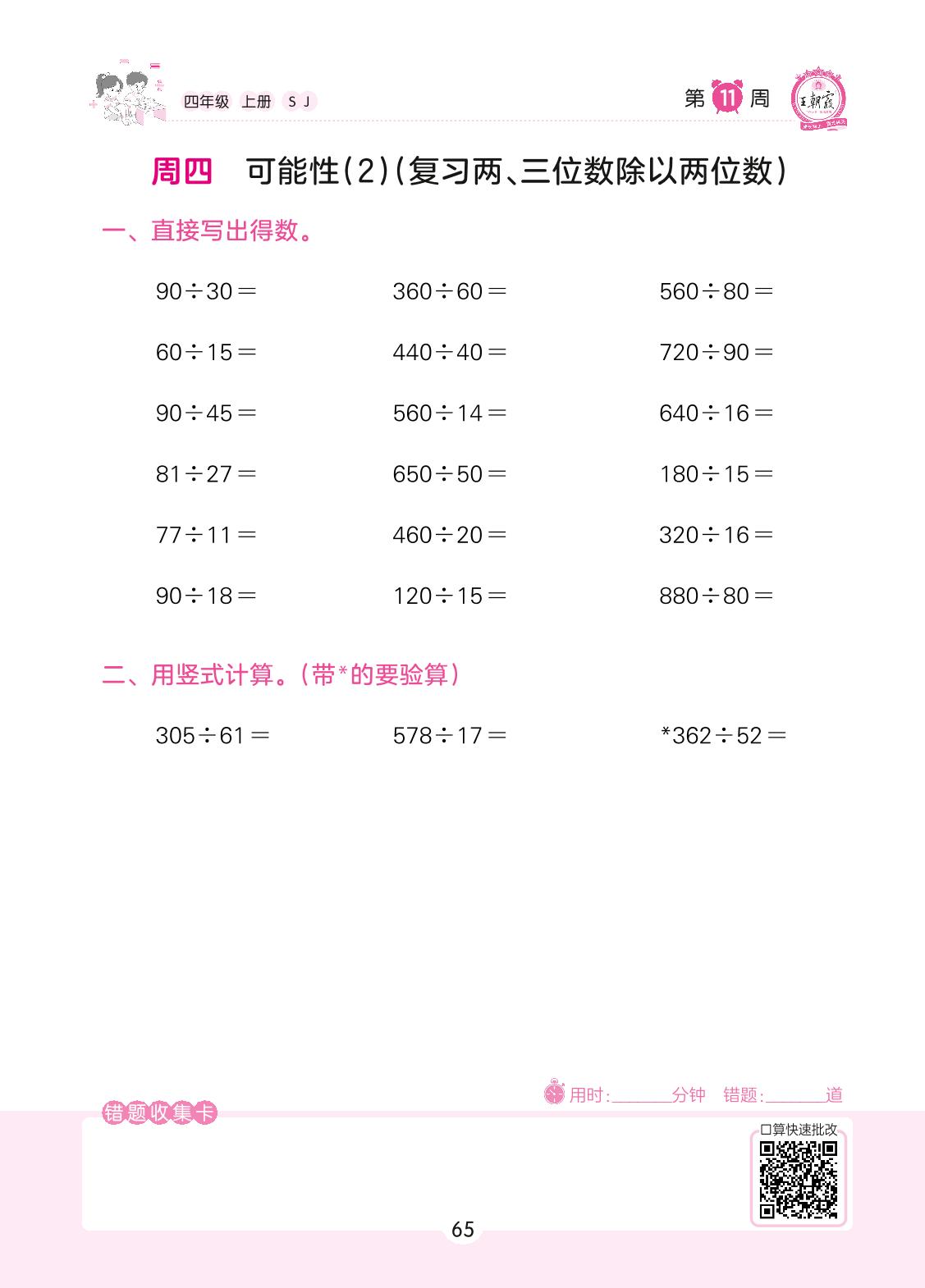 2022上册四年级数学苏教版 第11周 周四