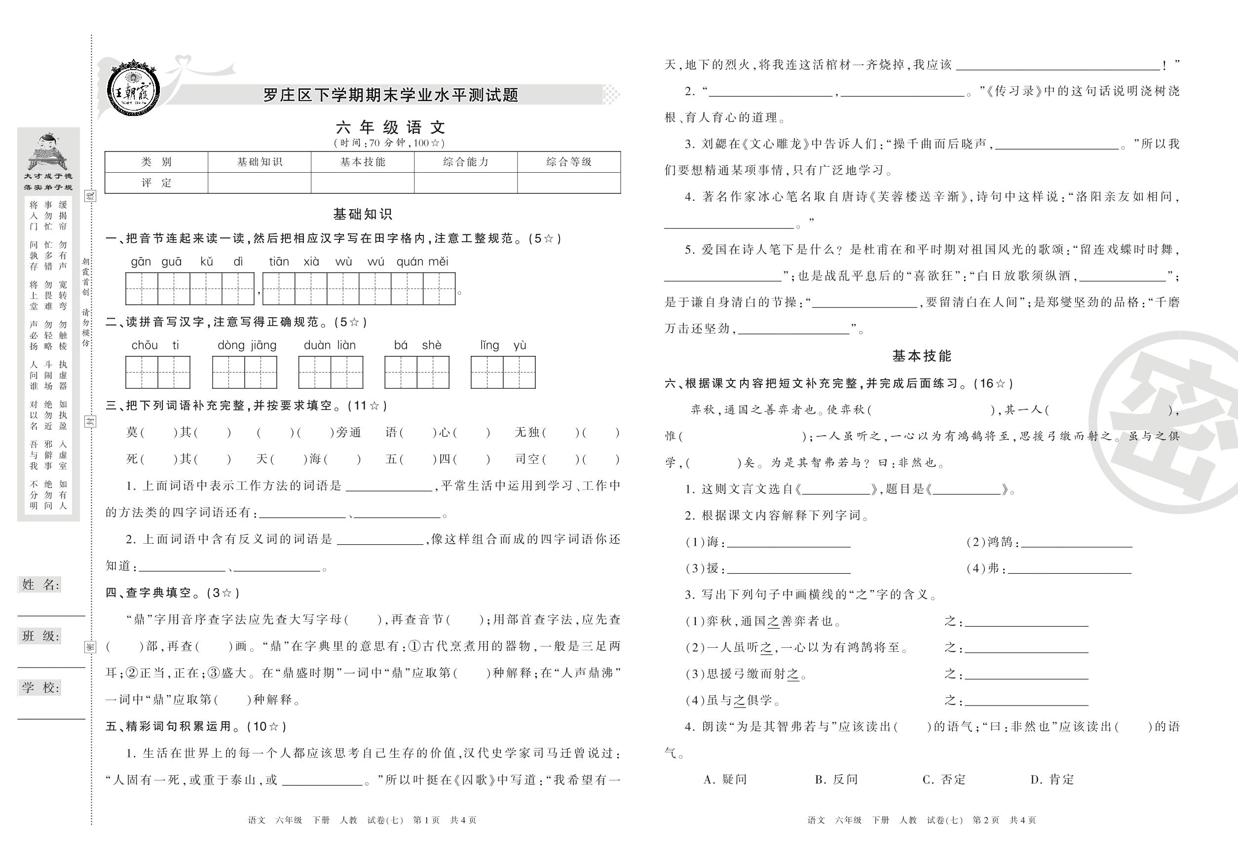 六年级语文人教版下册期末卷