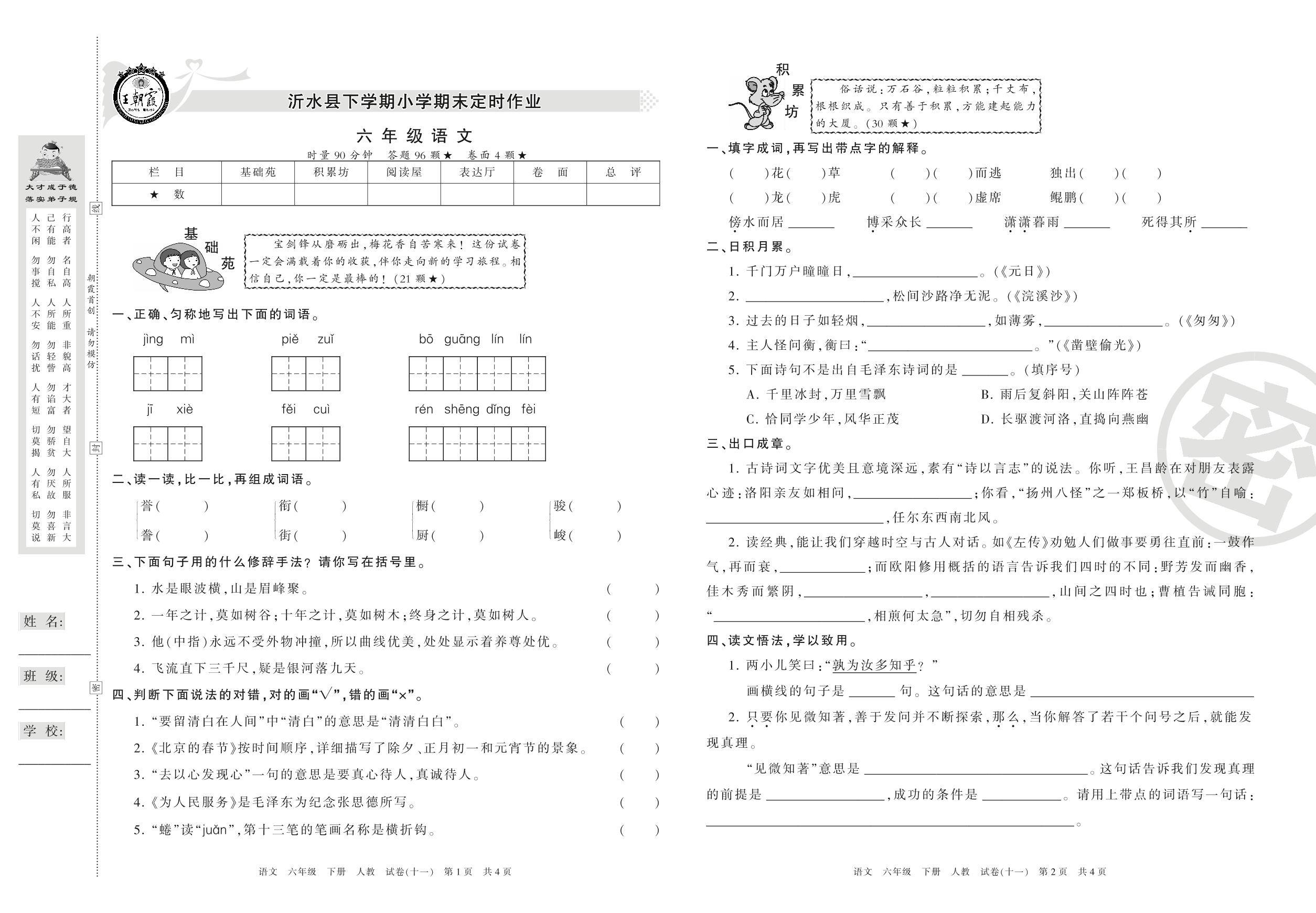 2015-2016学年第二学期临沂市沂水县六年级语文试卷(人教版)【11】
