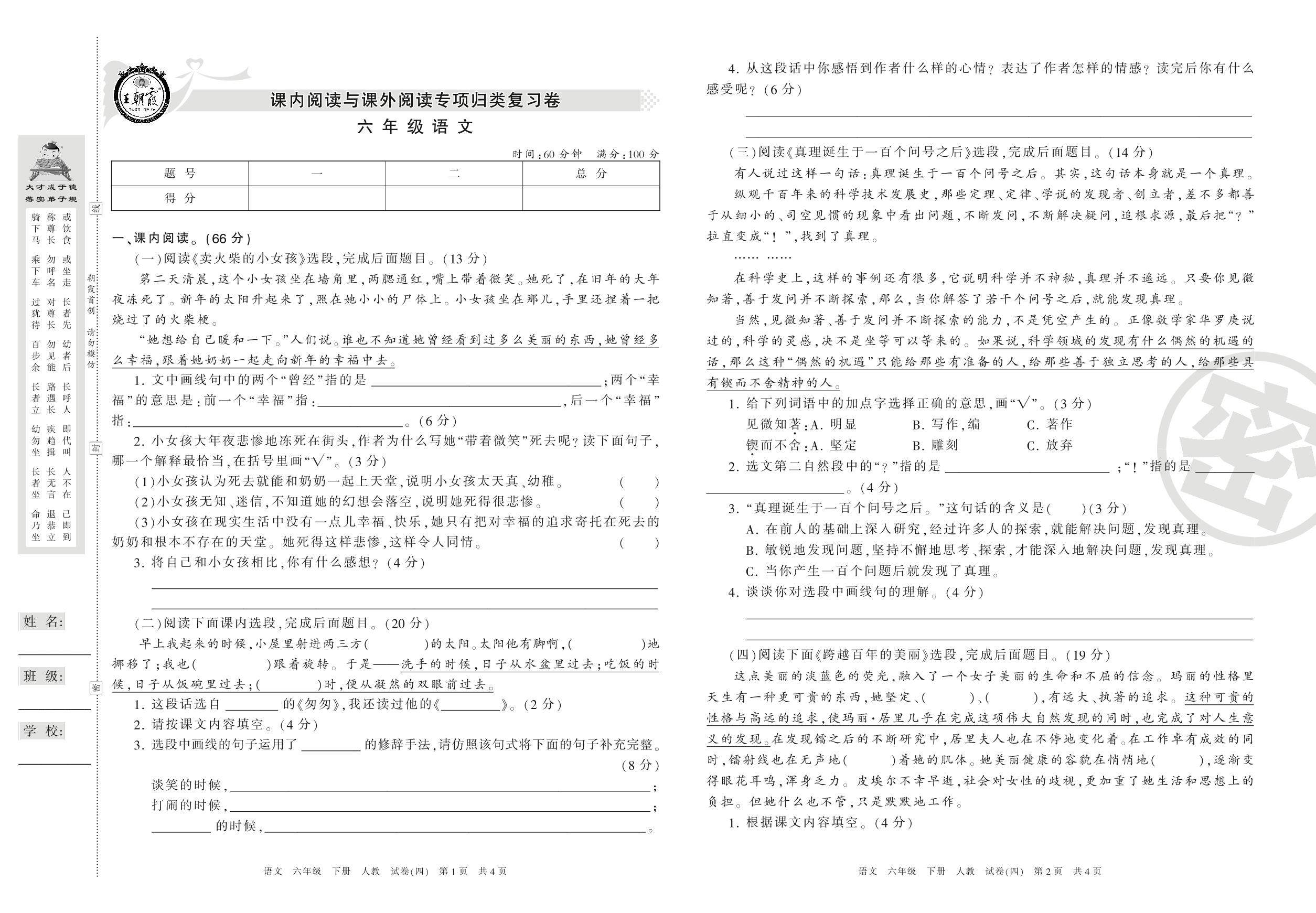 王朝霞期末专项卷六年级下册语文(人教版)_R21080285558【4】
