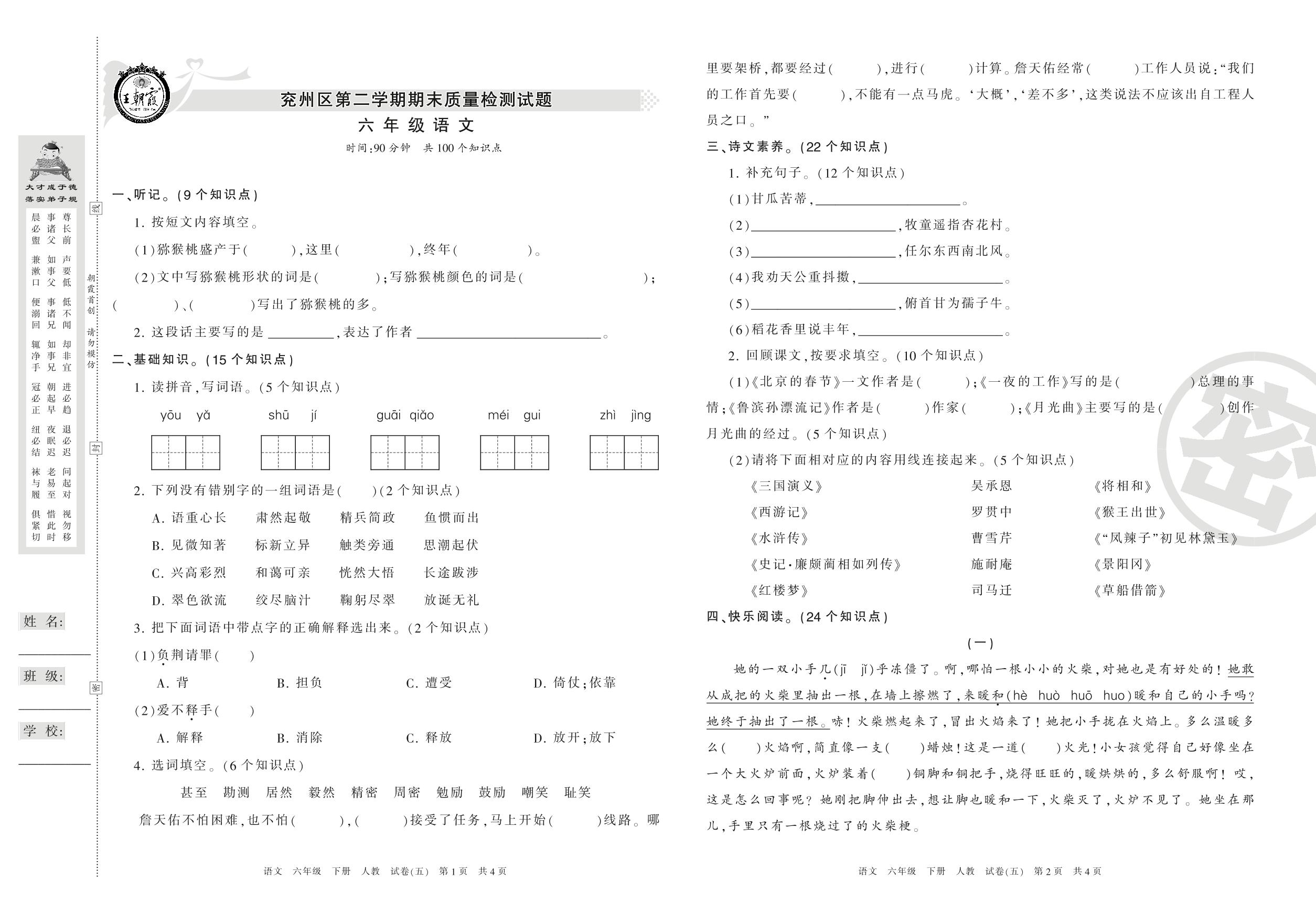 2015-2016学年第二学期济宁市兖州区六年级语文试卷(人教版)【5】