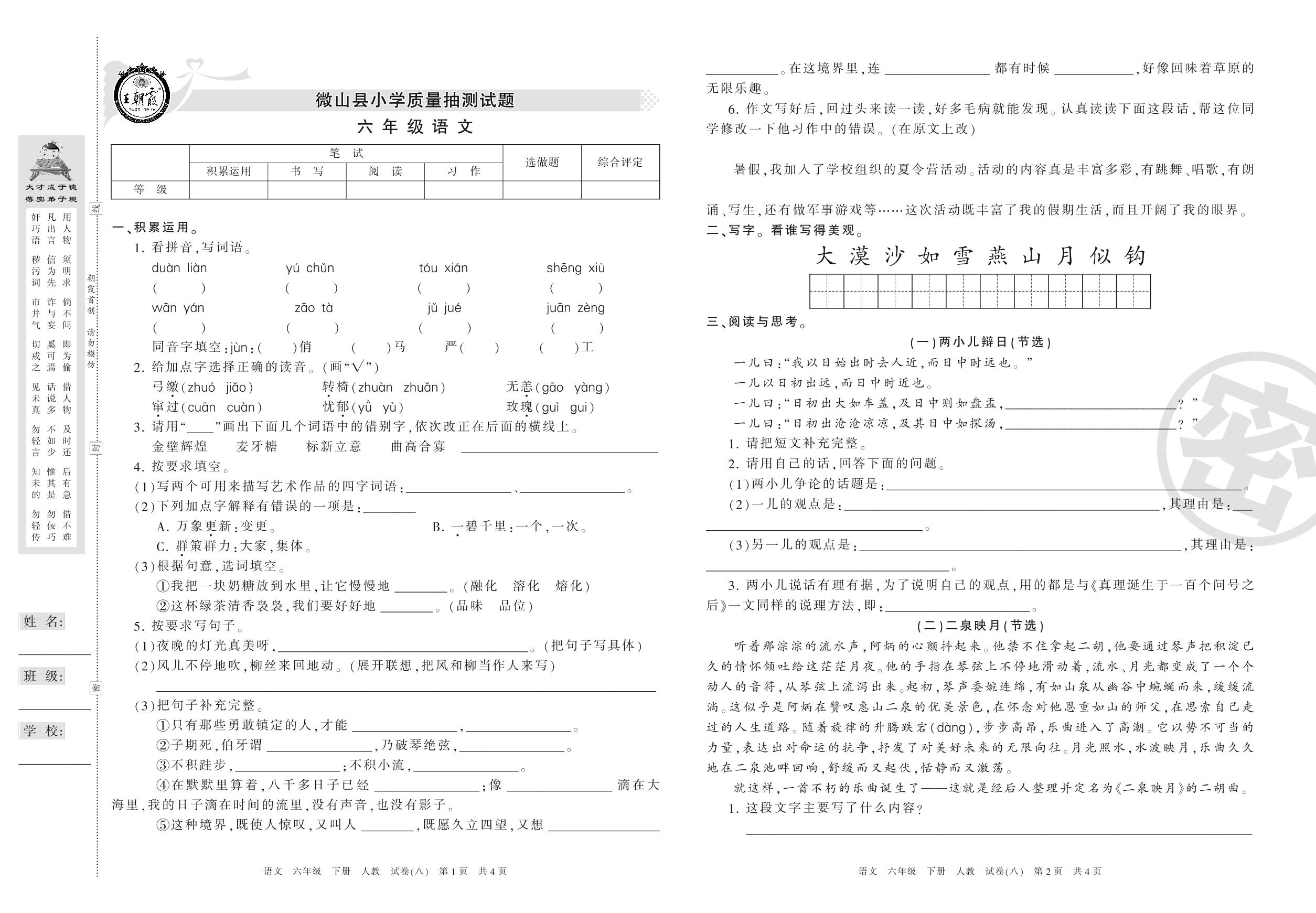 2015-2016学年第二学期济宁市微山县六年级语文试卷(人教版)【8】