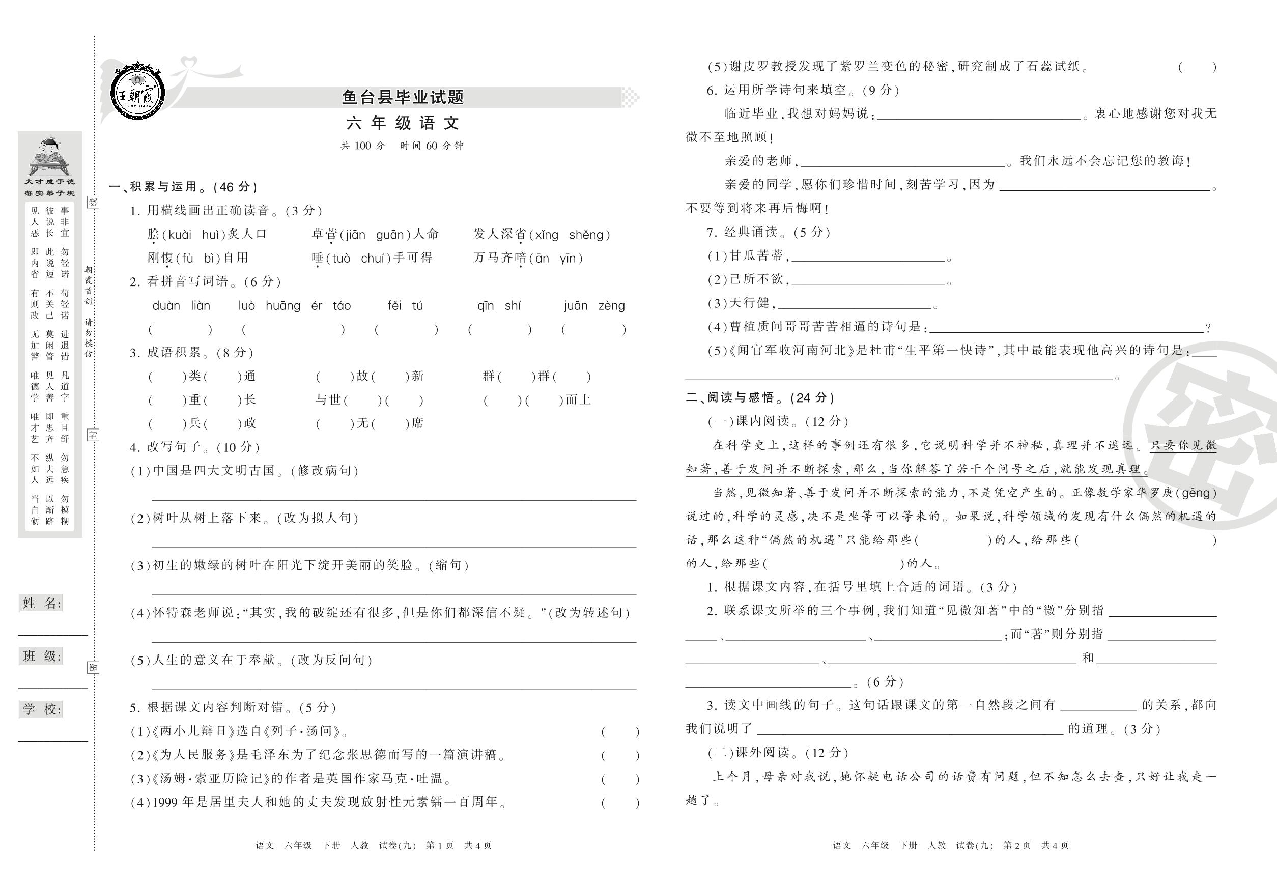 2015-2016学年第二学期济宁市鱼台县六年级语文试卷(人教版)【9】