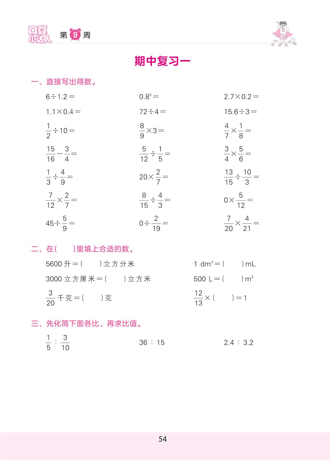 2022上册六年级数学苏教版 第9周 期中复习一(计算专练)