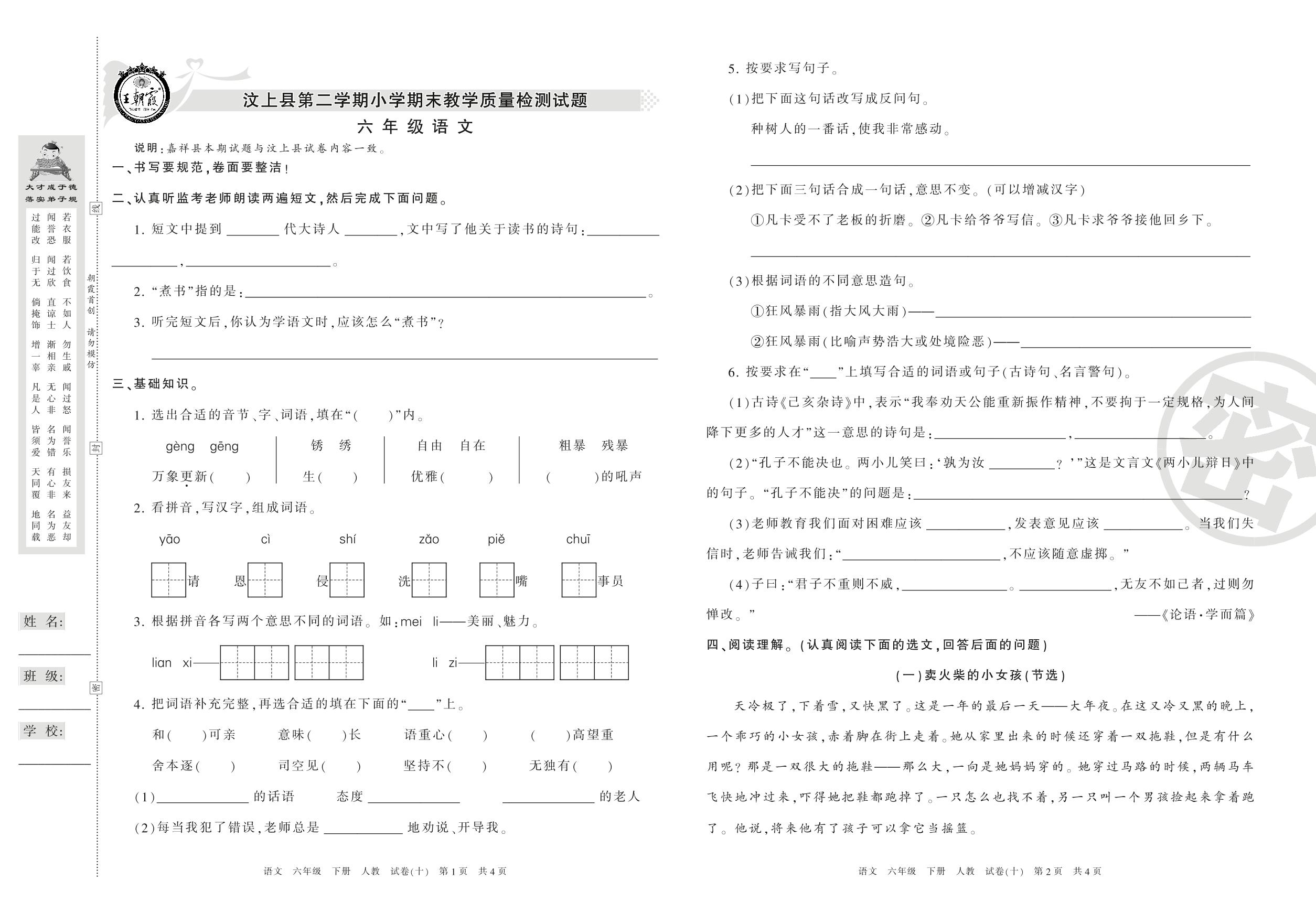 2015-2016学年第二学期济宁市汶上县六年级语文试卷(人教版)【10】