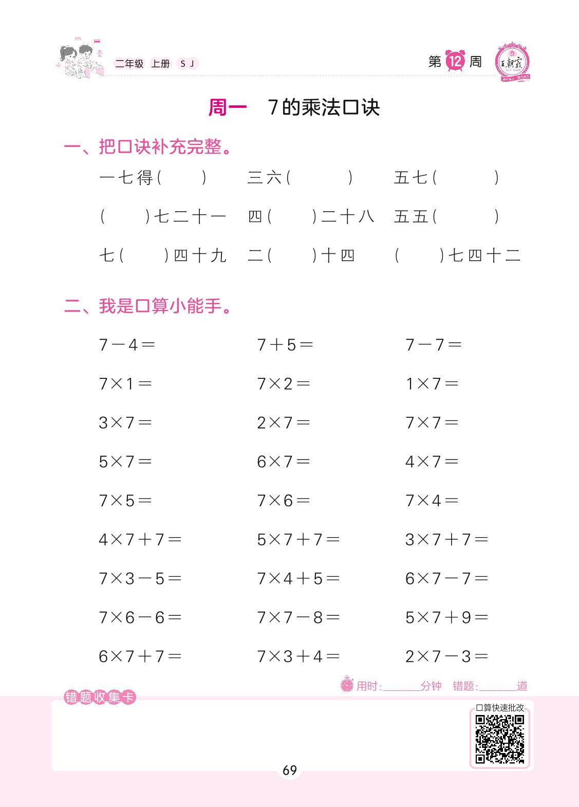 2022上册二年级数学苏教版 第12周 周一
