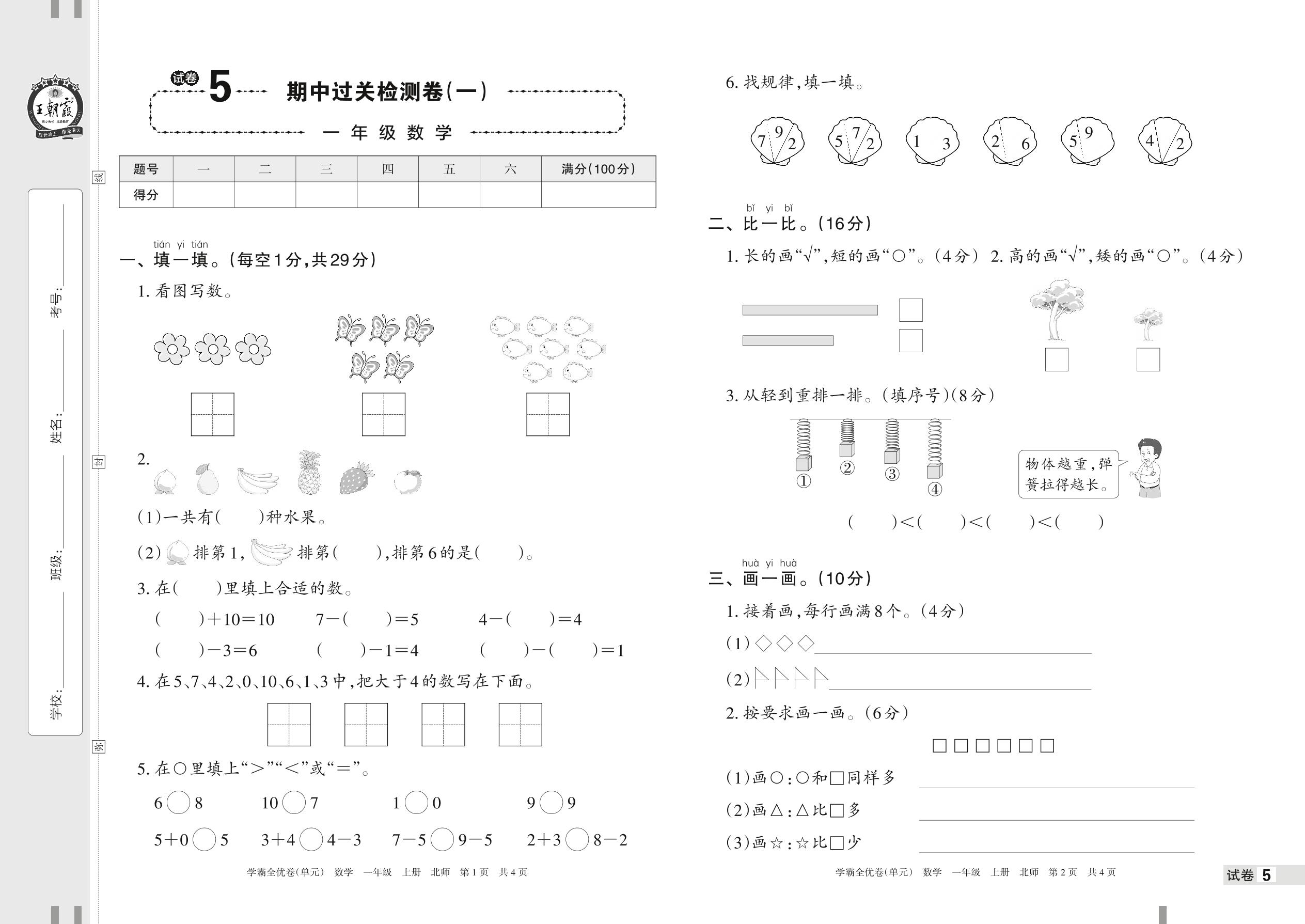 2022上册一年级数学北师版 试卷5 期中过关检测卷(一)