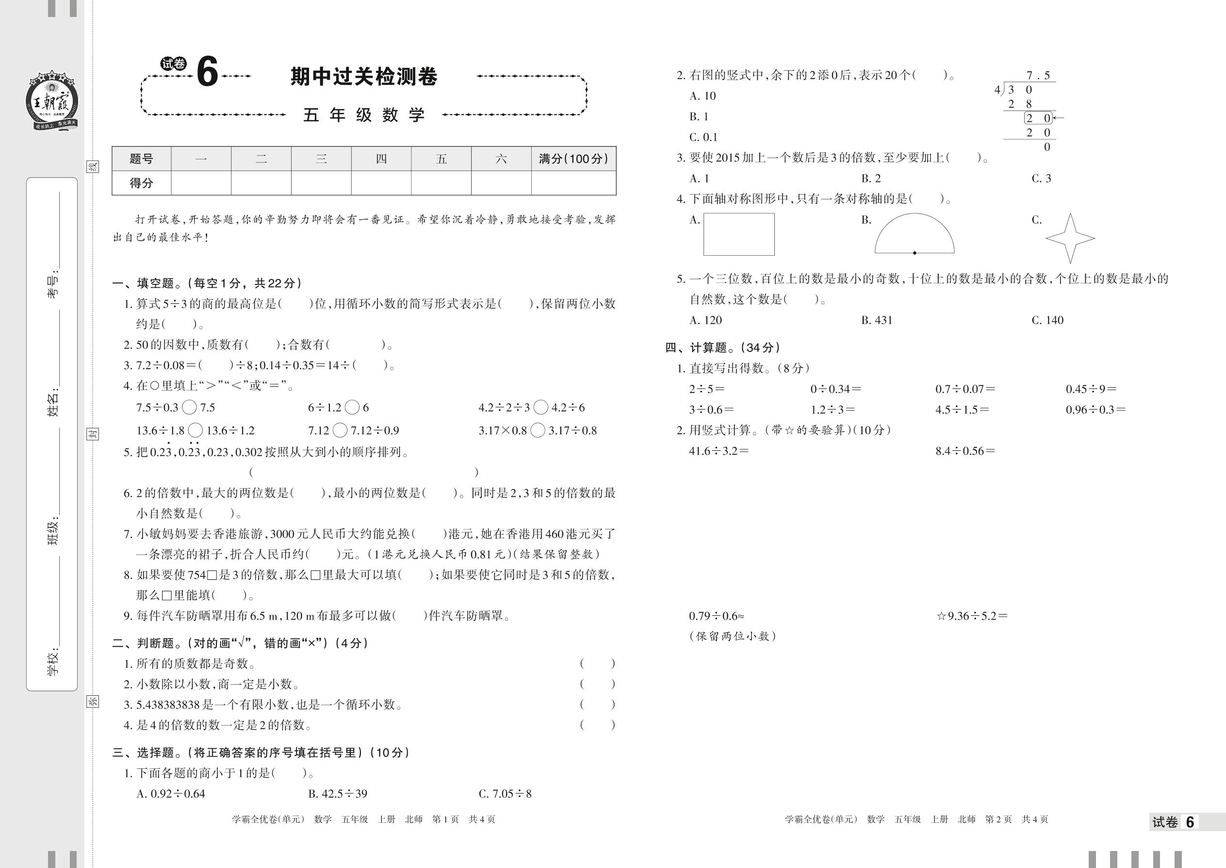 2022上册五年级数学北师版 试卷6 期中过关检测卷