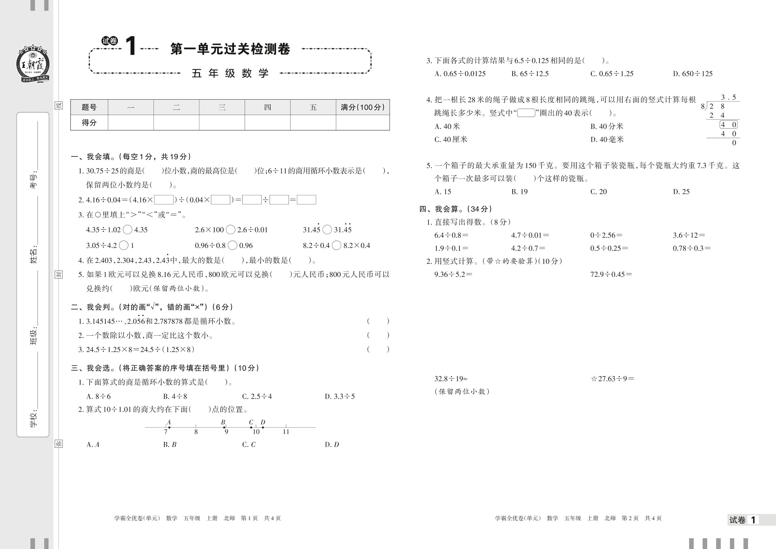 2022上册五年级数学北师版 试卷1 第一单元过关检测卷