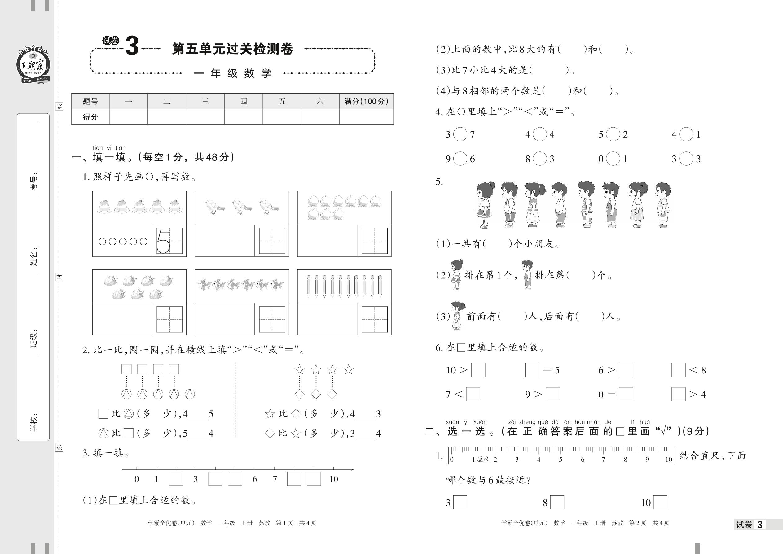 2022上册一年级数学苏教版 试卷3 第五单元过关检测卷