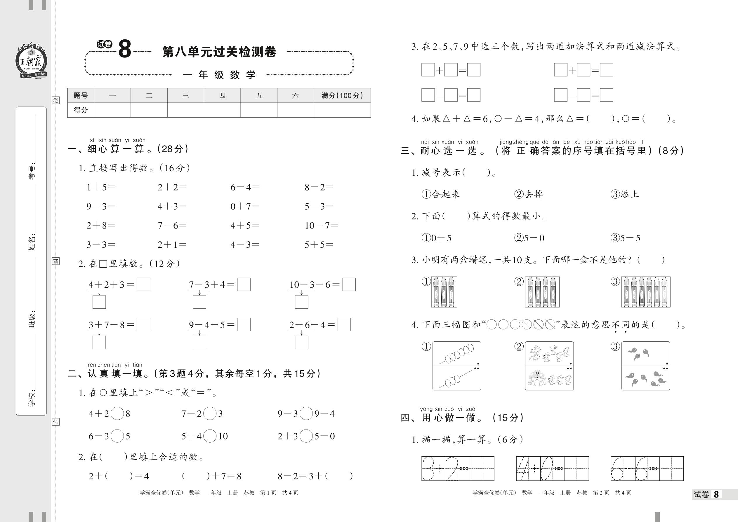2022上册一年级数学苏教版 试卷8 第八单元过关检测卷