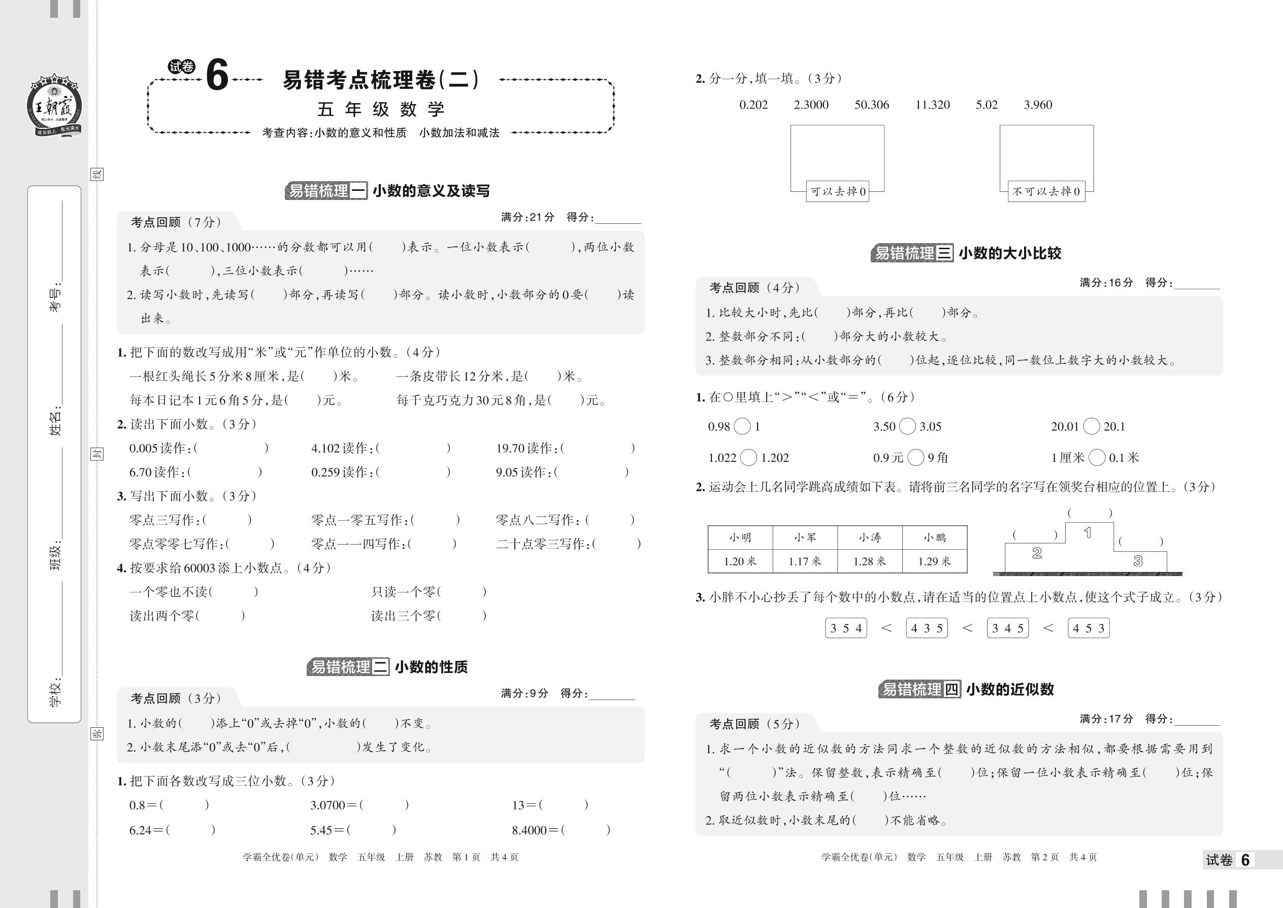 2022上册五年级数学苏教版 试卷6 易错考点梳理卷(二)