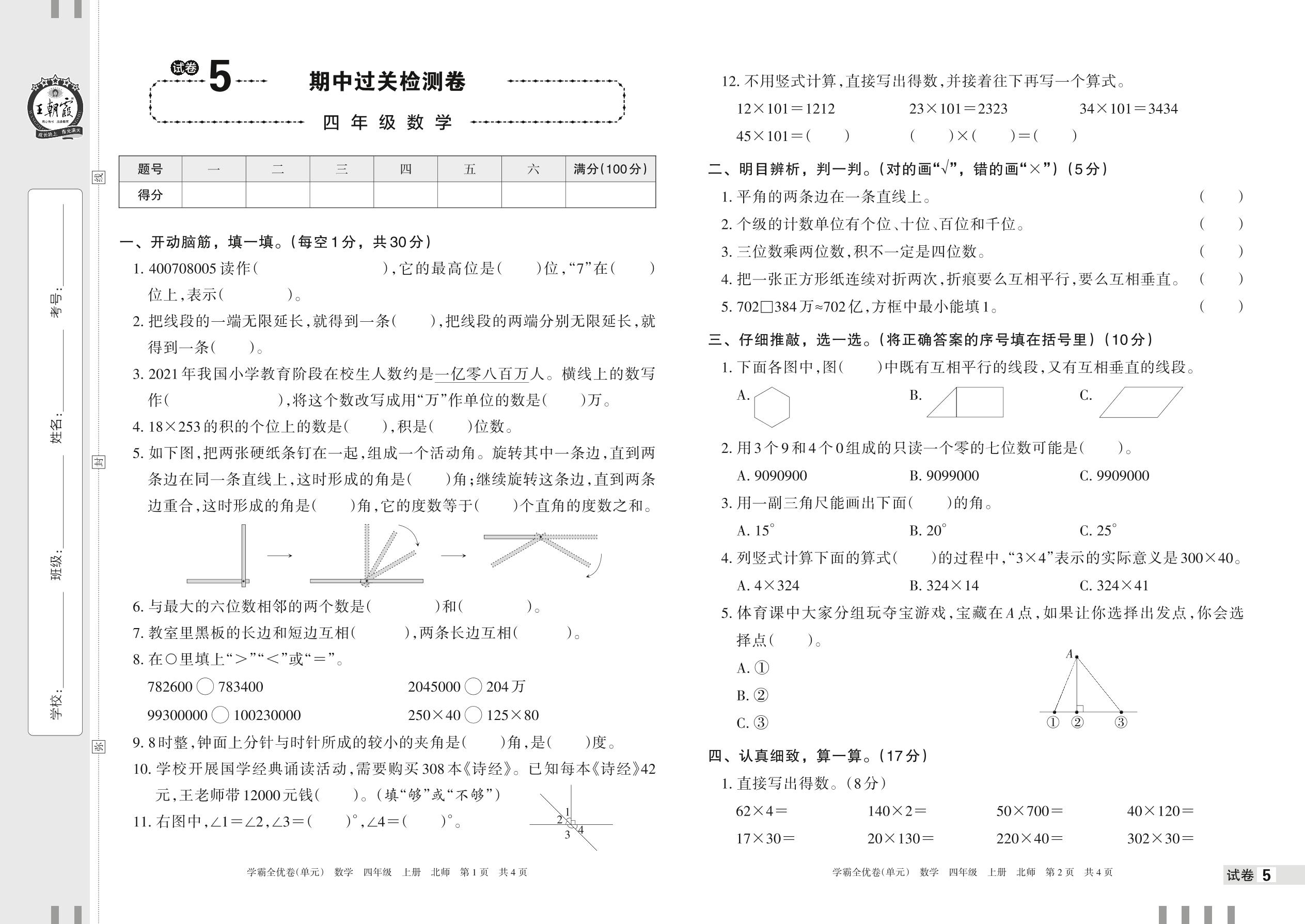 2022上册四年级数学北师版 试卷5 期中过关检测卷