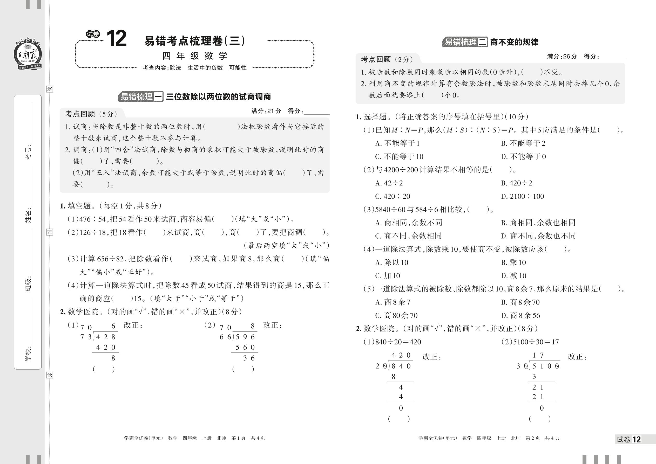 2022上册四年级数学北师版 试卷12 易错考点梳理卷(三)